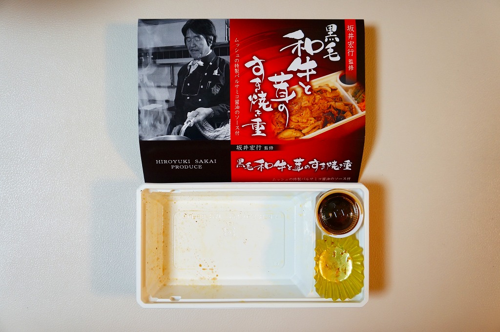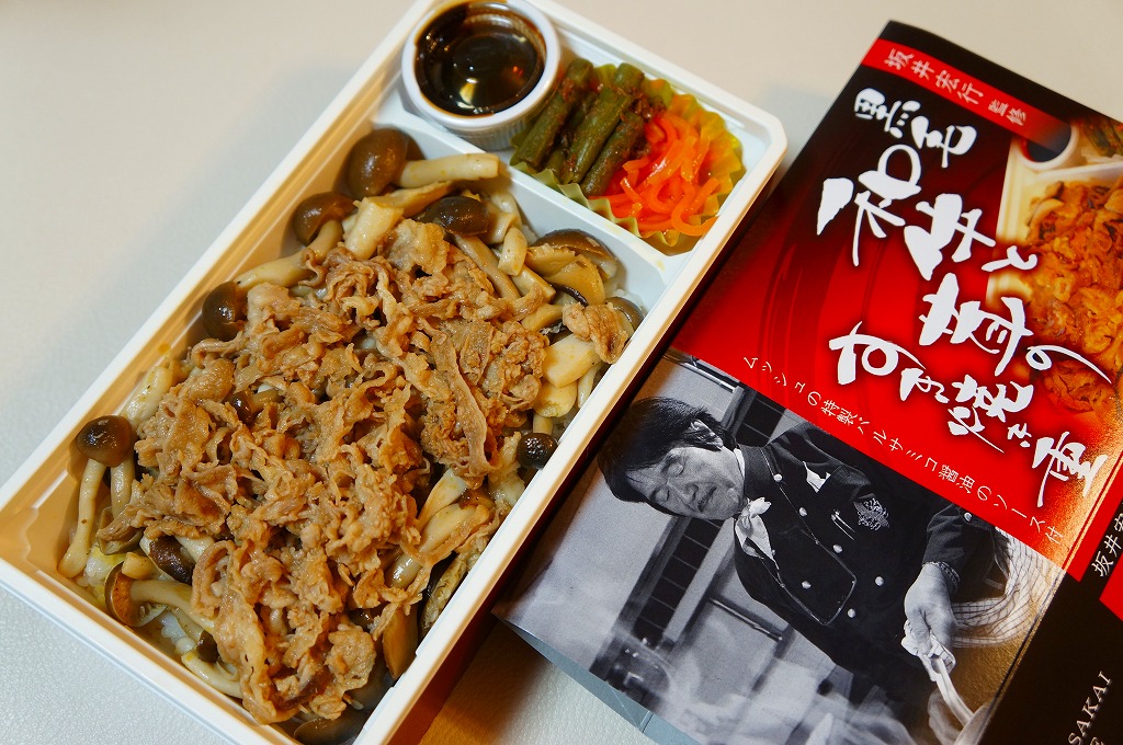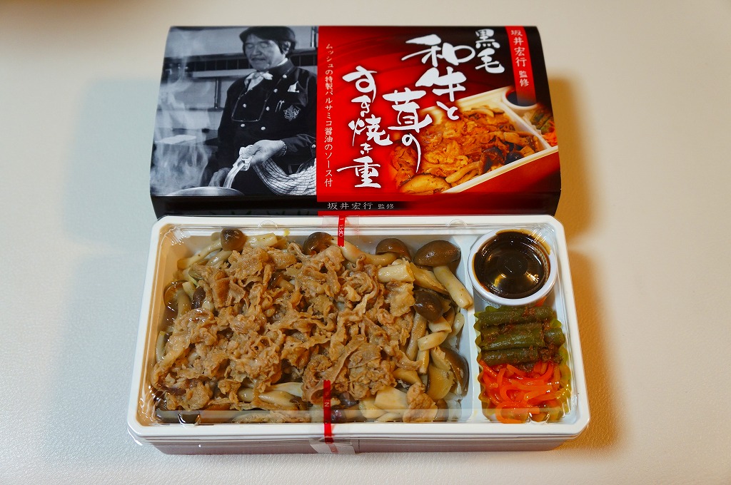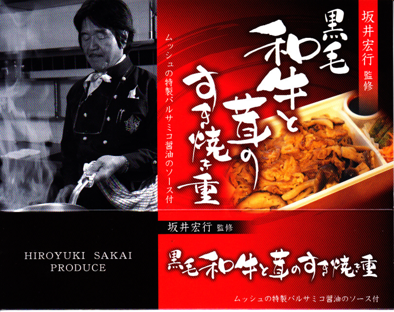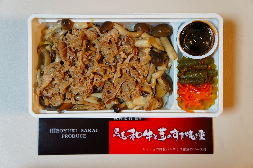 2014(平成26)年の発売か。「坂井宏行監修」を名乗るお弁当。ショウガ入りの御飯を、シメジやシイタケのソテーと牛肉煮で覆い、ニンジンとインゲンとバルサミコソースを添える。高級フランス料理店のキノコ牛丼なのか、薄くふんわりとしたすき焼き肉は、上質で柔らかくも味がない。特製バルサミコ醤油ソースをかけると、今度は激辛になってしまい、シンプルな内容なのに食べ方が難しい弁当だった。2015年までの販売か。