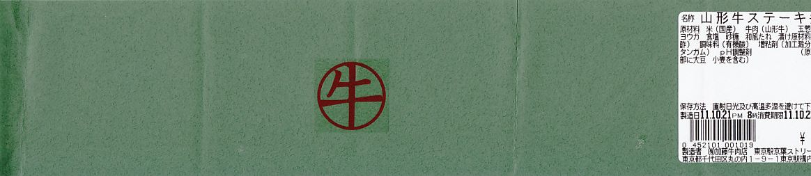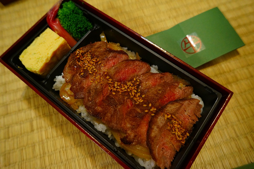 東京駅八重洲南口付近改札内の売店群「京葉ストリート」の牛肉店で注文販売されていたお弁当。注文から入手まで20分くらいかかった。木のように厚く固いボール紙製の長方形の容器に、「牛」のシールを貼った緑色の紙を巻く。中身は白御飯の上にタマネギ炒めを載せ、山形牛のステーキで覆い、ブロッコリー、みょうが、玉子焼を添えるもの。