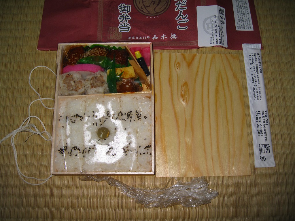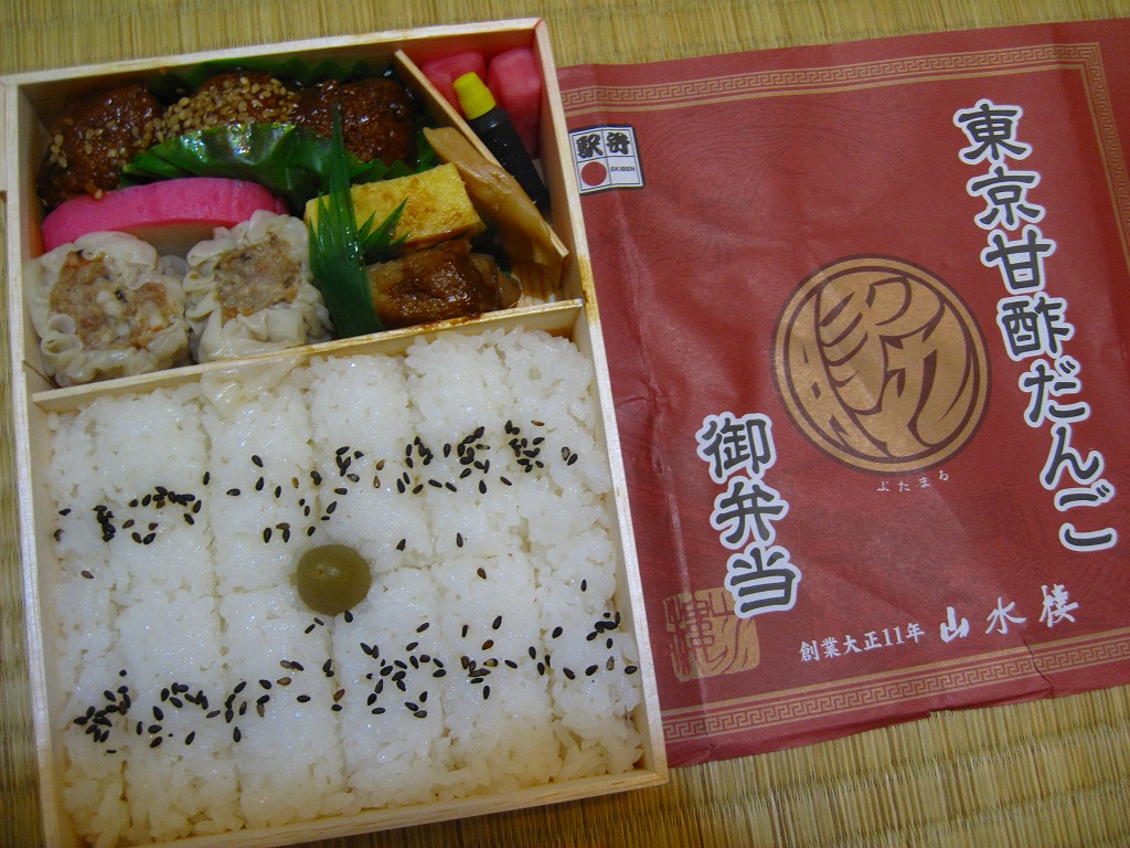木製の長方形の容器に、商品名と何らかのマークを印刷する紫色の掛紙を巻く。中身は俵飯風に至らぬ日の丸御飯に、肉団子が3個、エビ焼売が2個、カレイ味噌焼、玉子焼、かまぼこ、タケノコ煮、赤かぶ漬。横浜駅弁「シウマイ弁当」と名前や内容はかなり違うが、同じような機能と雰囲気を感じるもの。肉団子のみの単品販売(10個で280円)もあった。2012年までの販売か。