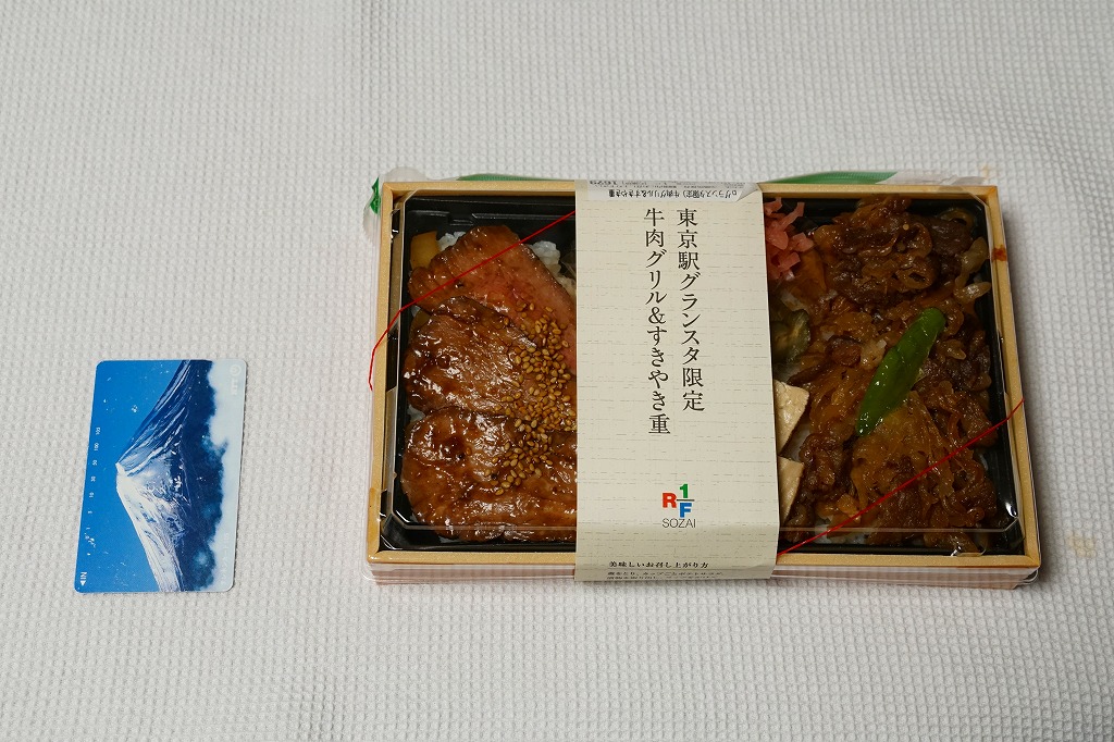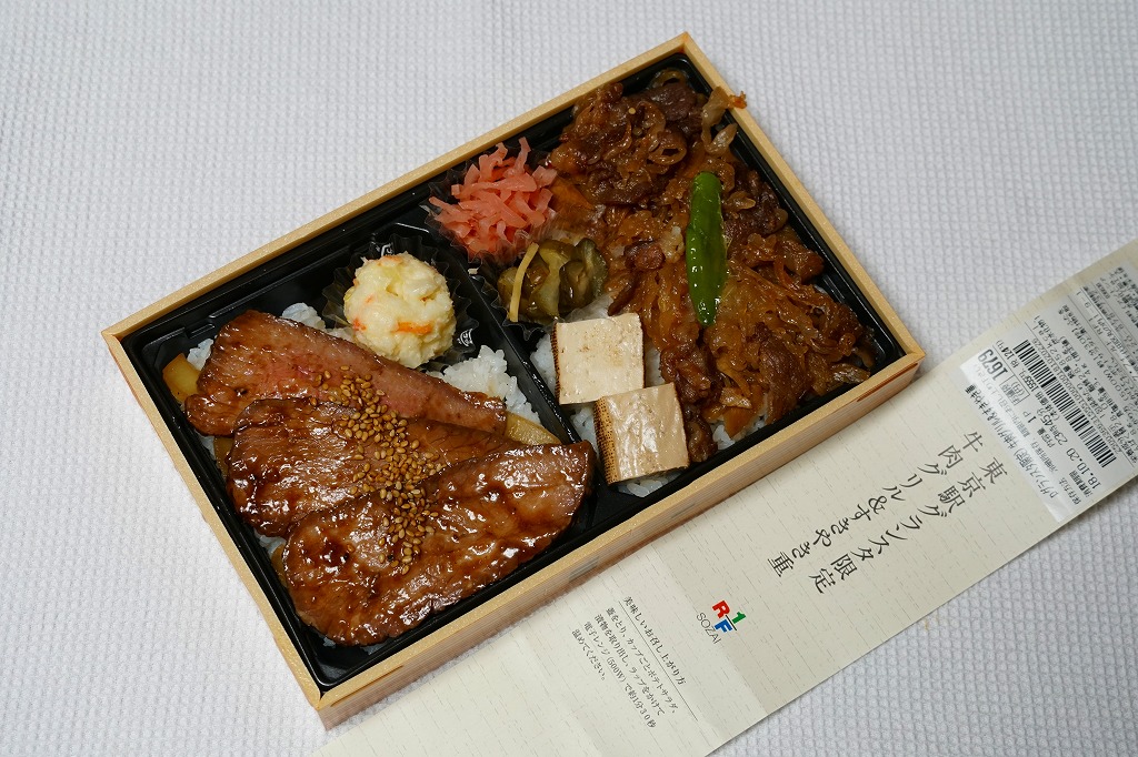 JR東日本のエキナカでもよく見掛け、日本中すべての百貨店のデパ地下に出店しているのではないかと思う「R1/F SOZAI」の牛肉弁当。掛紙に「東京駅グランスタ限定」と書いてあったので買ってみた。見た目は焼肉丼と牛丼のセット。2区画の白御飯の一方を3枚の牛焼肉とポテトサラダで覆い、他方を牛肉煮と焼豆腐と漬物類で覆うもの。作りたてのおいしい惣菜。