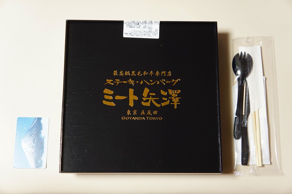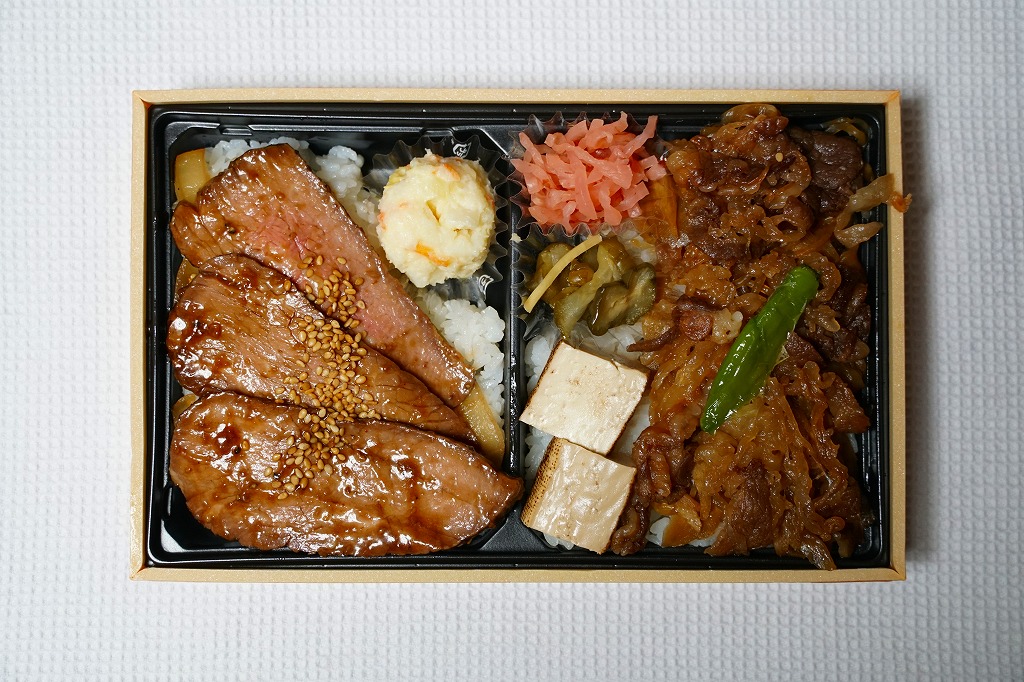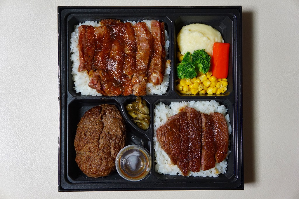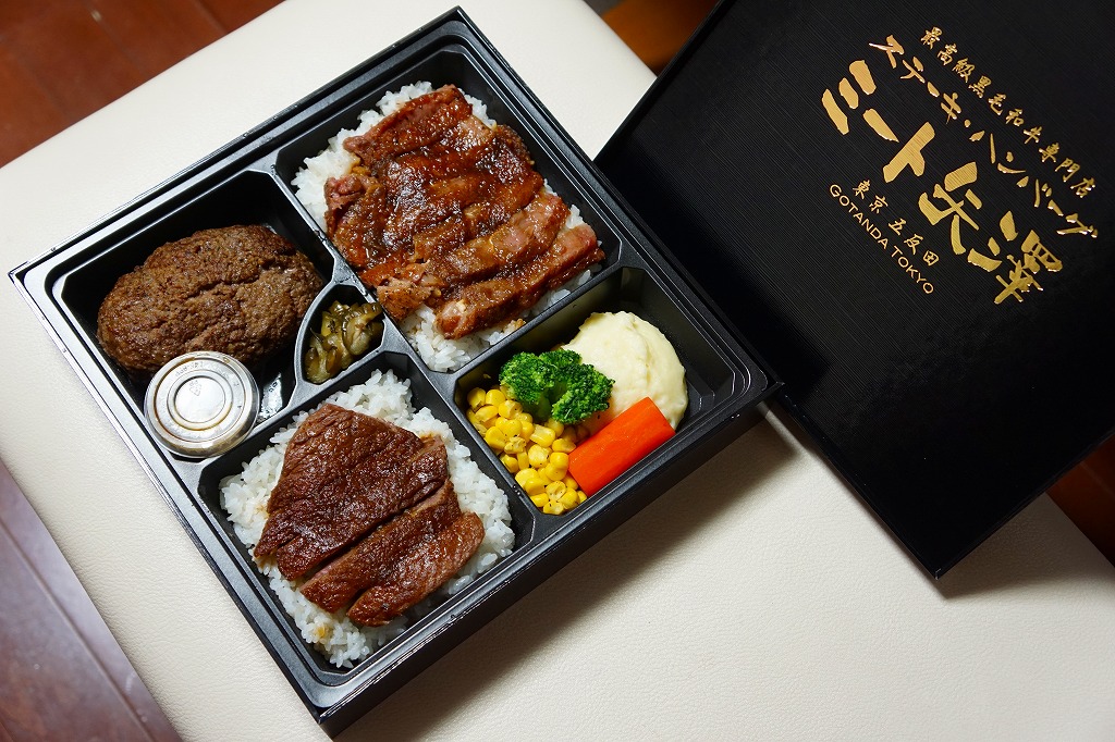 2012(平成24)年8月22日にオープンした大丸東京店の地下食料品売り場「お弁当ストリート」のテナント「ミート矢澤」で調製する持ち帰り弁当。店の名を金文字で記す木製風の黒いボール紙容器に詰めた黒いトレーに、サーロインステーキを載せた白御飯、シャトーブリアンステーキを載せた白御飯、黒毛和牛ハンバーグとソースと漬物、コーンとニンジンとブロッコリーとマッシュポテトを並べる。