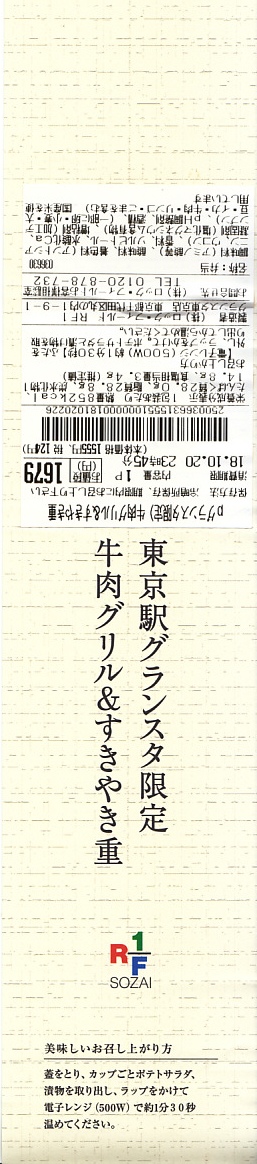 JR東日本の100%子会社である鉄道会館が2018(平成30)年10月1日から11月18日まで東京駅構内で実施した、「第3回東京駅丼グランプリ」へのエントリー作のひとつ。エキナカの76店が丼ものの弁当やメニューで勝負し、これは一日20個を提供して第6位になったという。東京都心を中心に日本全国のデパートや商業施設に店舗を展開する牛肉弁当屋の商品。