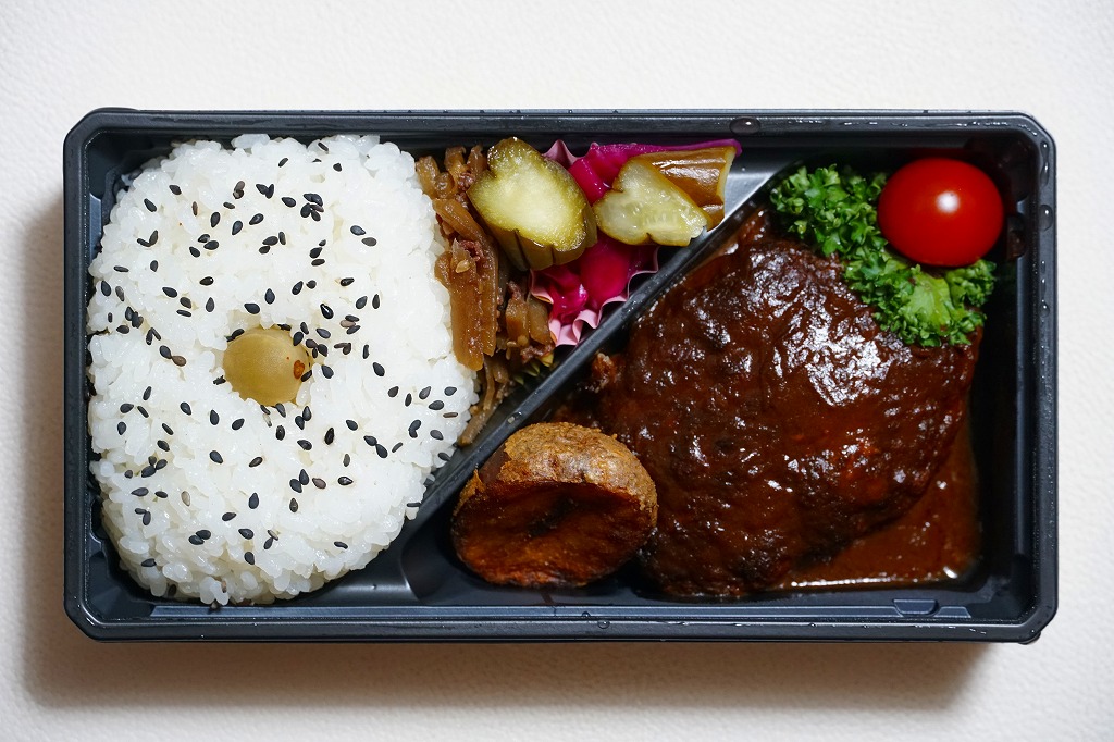 2012(平成24)年8月22日にオープンした大丸東京店の地下食料品売り場「お弁当ストリート」のテナント「ミート矢澤」で調製する持ち帰り弁当。同店専用の大きな紙容器に詰めた黒いトレーに、ニンニクを振りかけた白御飯、ハンバーグ、コーン、ニンジン、ブロッコリー、マッシュポテト、ソース、漬物を、たっぷりの空間に並べていた。和風洋食な美しいハンバーグステーキ。普通に考えると高価だが、この店舗では最も安い弁当であった。