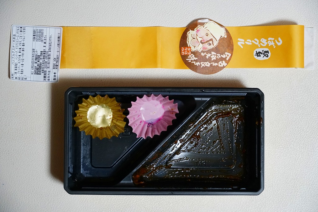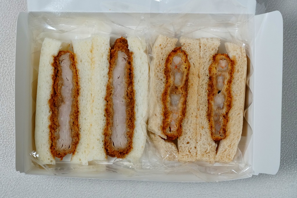 ブタを相撲取り姿とエビフライ衣装で描いた専用の紙箱に、ひれカツサンドを2切れ、えびかつサンドを2切れ、それぞれ袋詰めして詰めて、辛子とタルタルソースを添付する。同社で既存のひれカツサンドと、JR名古屋駅店限定で2021年9月に売り出したというえびかつサンドの詰合せ。矢場とんのファンでなければ、普通においしいコンパクトなカツサンド。