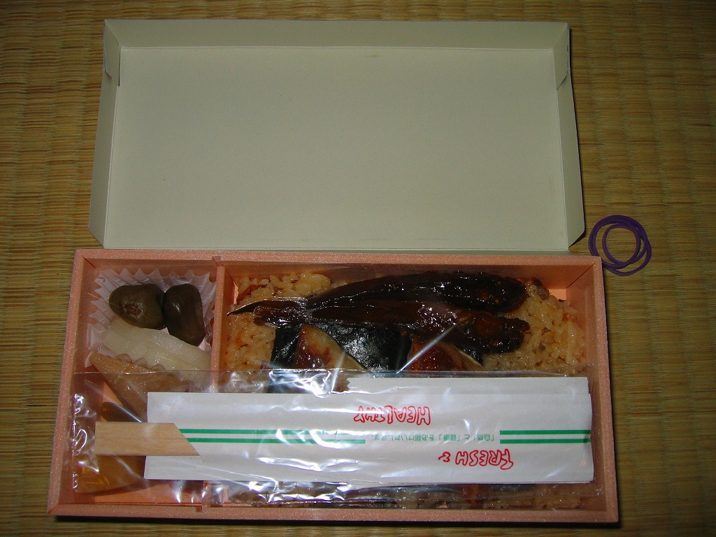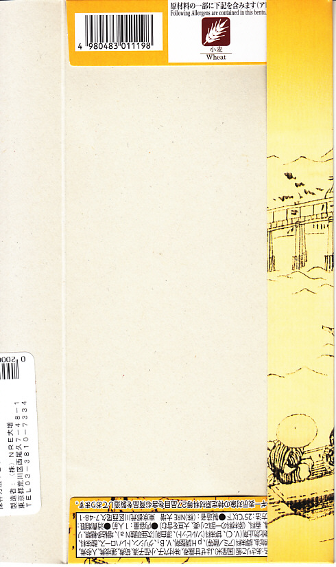 2001(平成13)年10月14日に購入した、東京駅弁のボール紙製パッケージ。上記の2008年時点のものと比べて、価格や製造者の名称など食品表示ラベルの内容が異なるが、その他に違いはほとんどない。