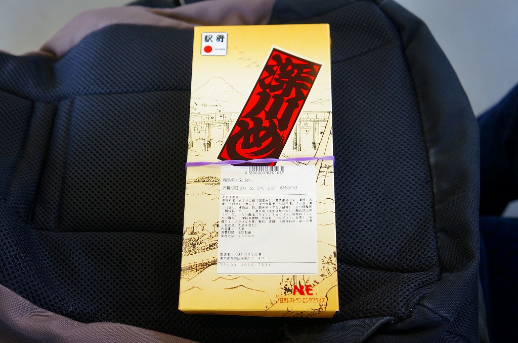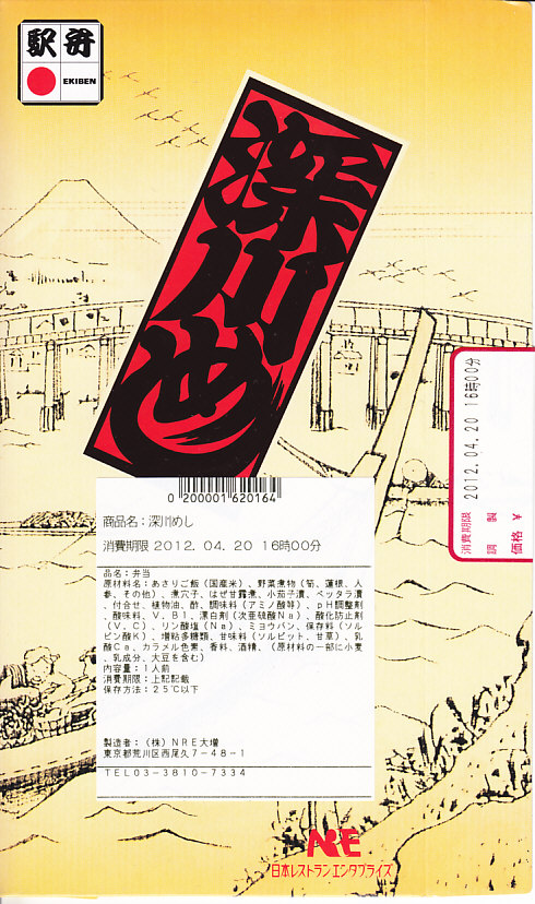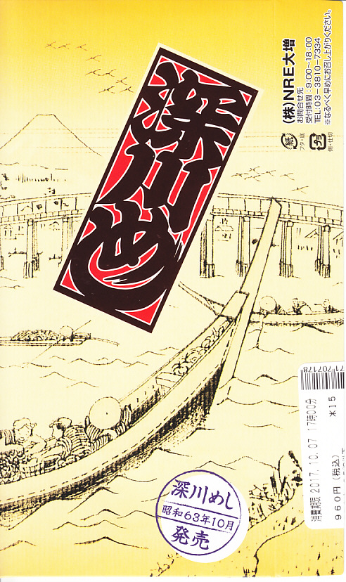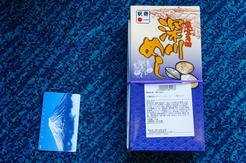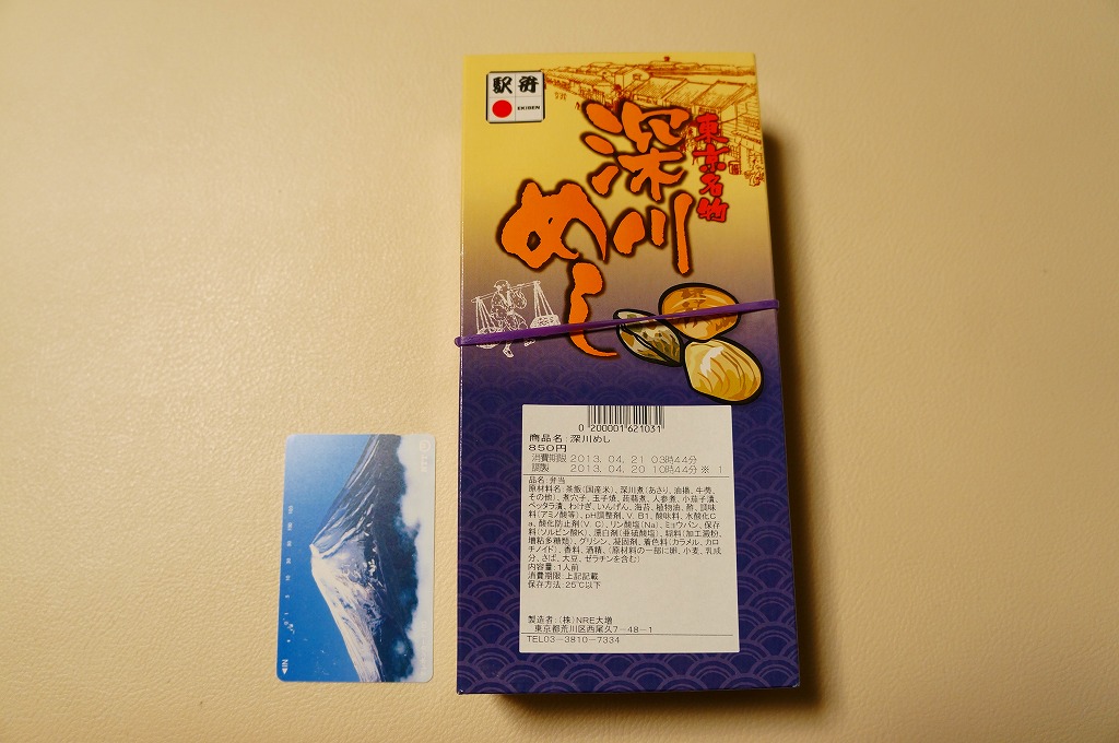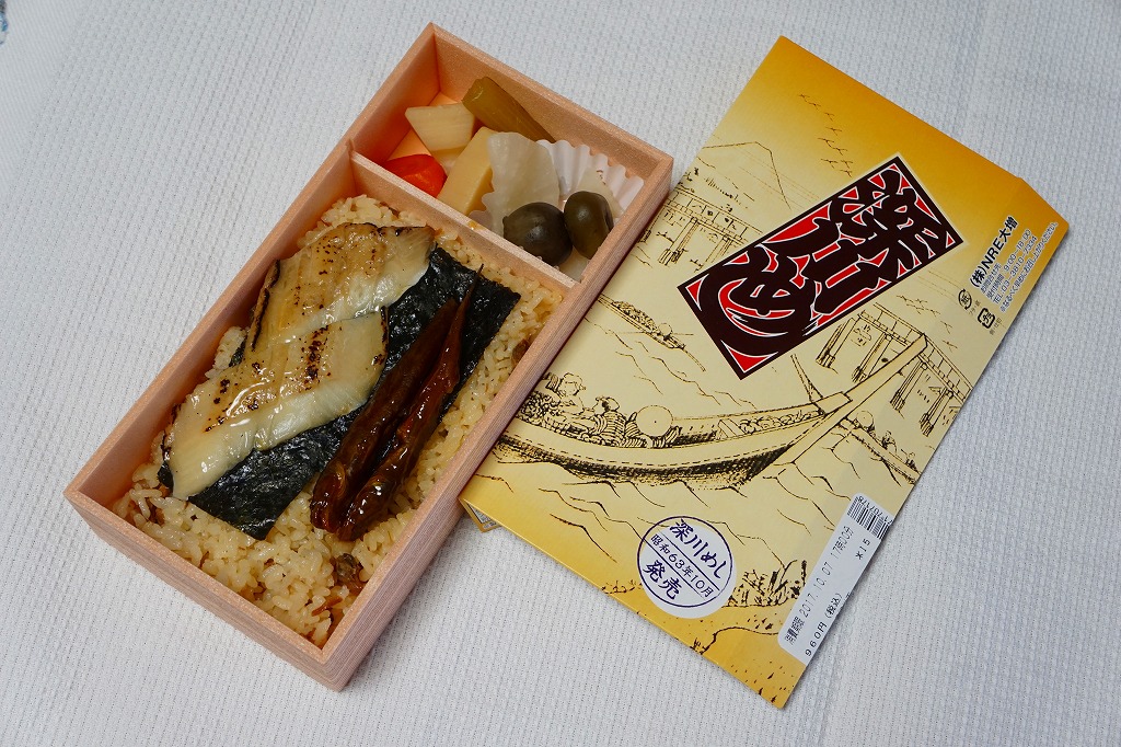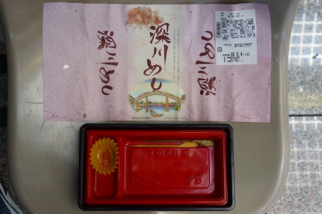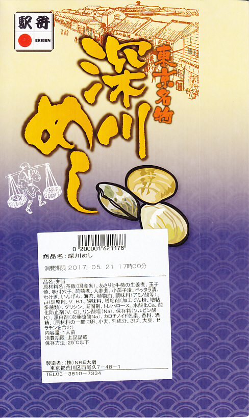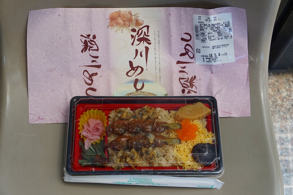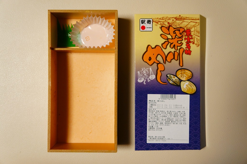 深川飯の駅弁については、JR東日本の子会社である日本レストランエンタプライズ(NRE)と、JR東海の子会社であるジェイアール東海パッセンジャーズ(JRCP)でほとんど同じ商品を出しており、東京エリアでそれぞれの駅構内にて販売している。これは在来線コンコースで買ったNRE版。