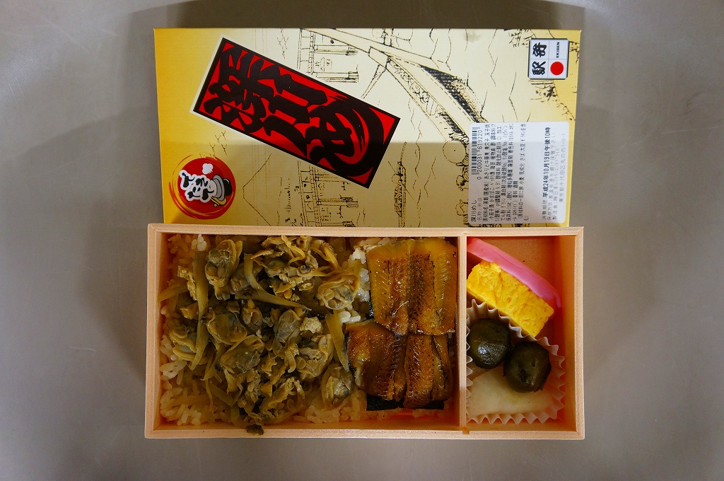 デパ地下弁当タイプのプラ容器に透明なふたをして、商品名と木橋を描いた桃色の掛紙で巻く。中身は茶飯をアサリ煮と焼アサリ串と錦糸卵で覆い、タケノコとシイタケも載せ、山菜と大根桜漬を添える。味は淡泊で、付合せも滋味がなく、業務用冷凍食品の多用を感じ、在来線のNRE(日本レストランエンタプライズ)や東海道新幹線のJRCP(ジェイアール東海パッセンジャーズ)の東京駅弁より二段くらい落ちる印象。掛紙の絵柄とともに、寂しさのある落ち着き。
