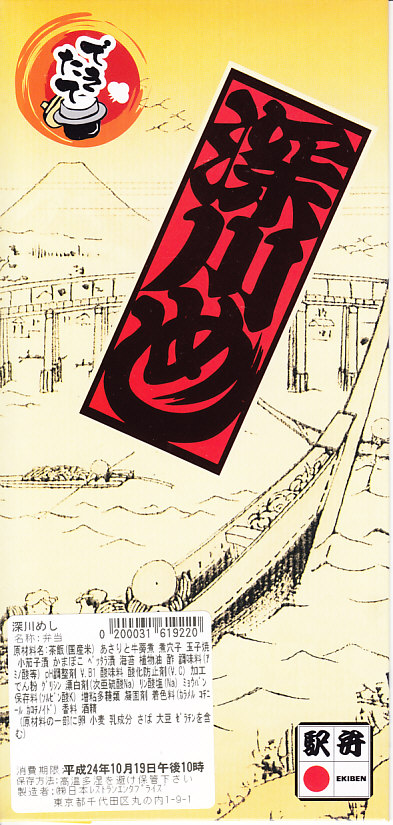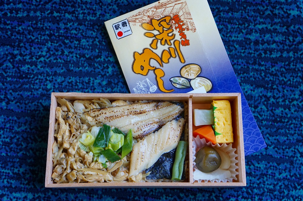 1987(昭和62)年に発売した、東京駅を代表する人気駅弁のひとつ。長方形の容器に江戸の風景を描いたボール紙でふたをして輪ゴムで留める。中身はアサリの炊込飯に海苔を敷いて、アナゴの蒲焼きとハゼの甘露煮を2個ずつ載せ、小ナス漬やべったら漬に煮物数個を添えるもの。現在の東京都江東区深川あたり、隅田川の河口周辺で江戸時代から親しまれた炊込飯を駅弁化したもの。2011年現在で一日あたり500個以上が売れているという。