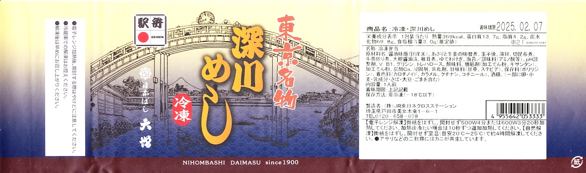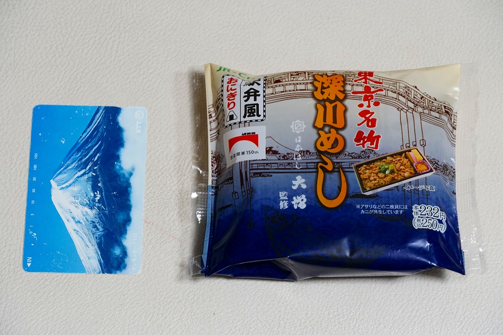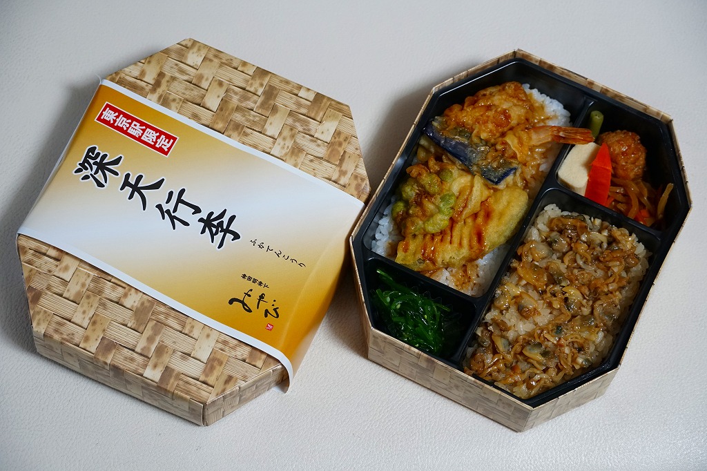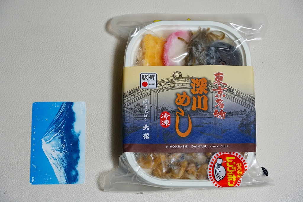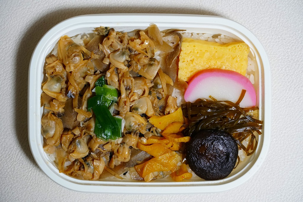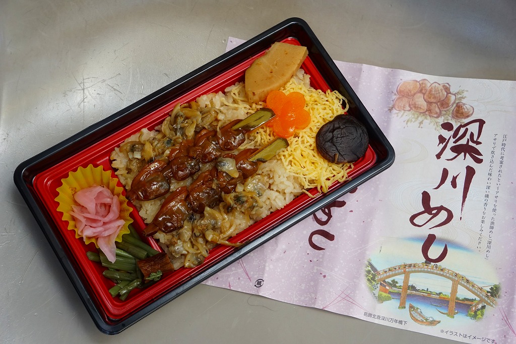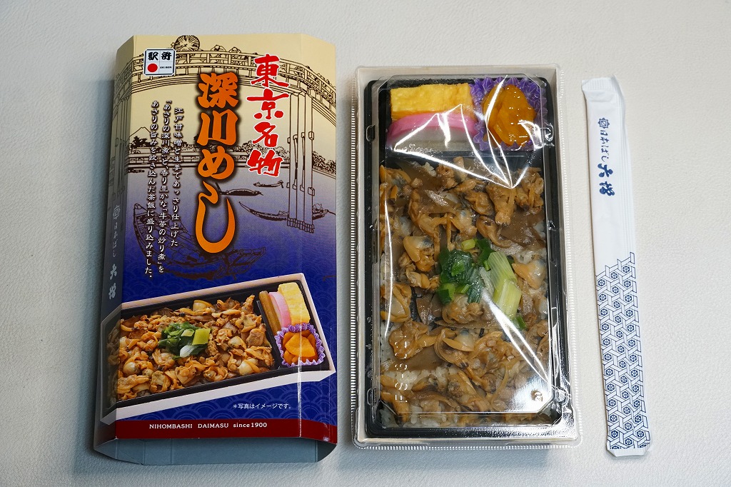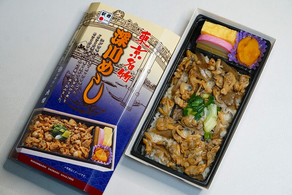 東京駅で買える深川めしのうち、これを1987(昭和62)年に発売した日本食堂の後身でないところが作るもの。駅弁屋や食堂会社でなく、鉄道弘済会売店「キヨスク」の流れをくむ弁当売店「膳まい」で売られる。調製元は東京から遠く伊豆半島の弁当製造業者。