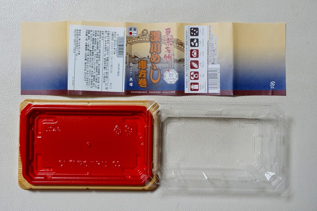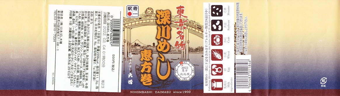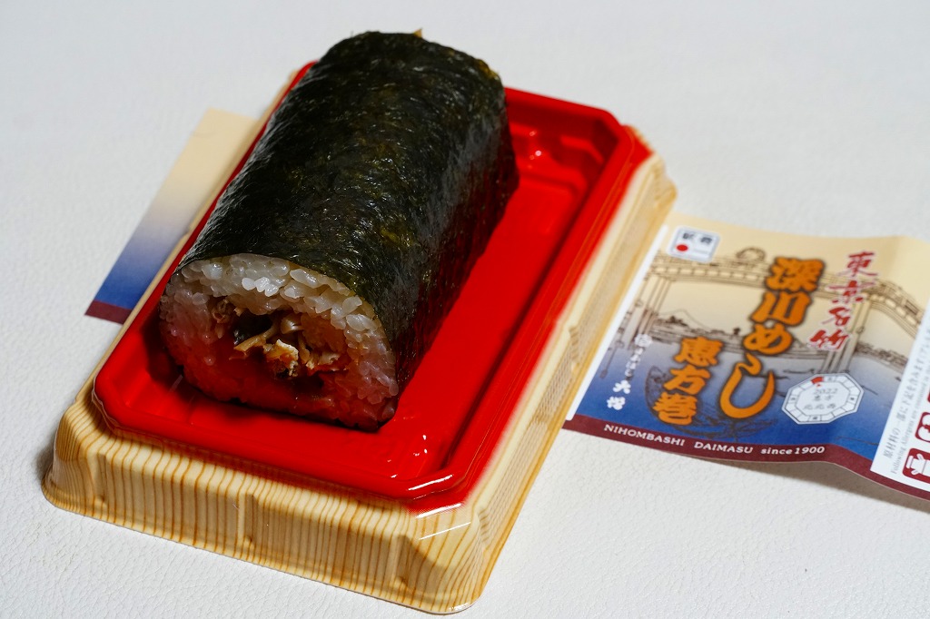 2020(令和2)年2月3日に650円で発売、2021年の販売はなく、2022年2月3日にも販売。2000年代に節分での販売が定着し、駅弁でも各地で出ている恵方巻きについて、東京駅の名物駅弁「深川めし」のものが作られた。あさりだし茶飯、あさり味噌煮、玉子焼、ごぼう煮、かに風味かまぼこを海苔で巻いた、小柄な太巻きを1本、プラ製トレーに収め、掛紙を巻く。掛紙の絵柄と具材が、現行の駅弁から取り入れられている。2020年のアナゴ煮と海苔で半分ずつ巻く姿が、今回は普通の海苔巻きとなった。