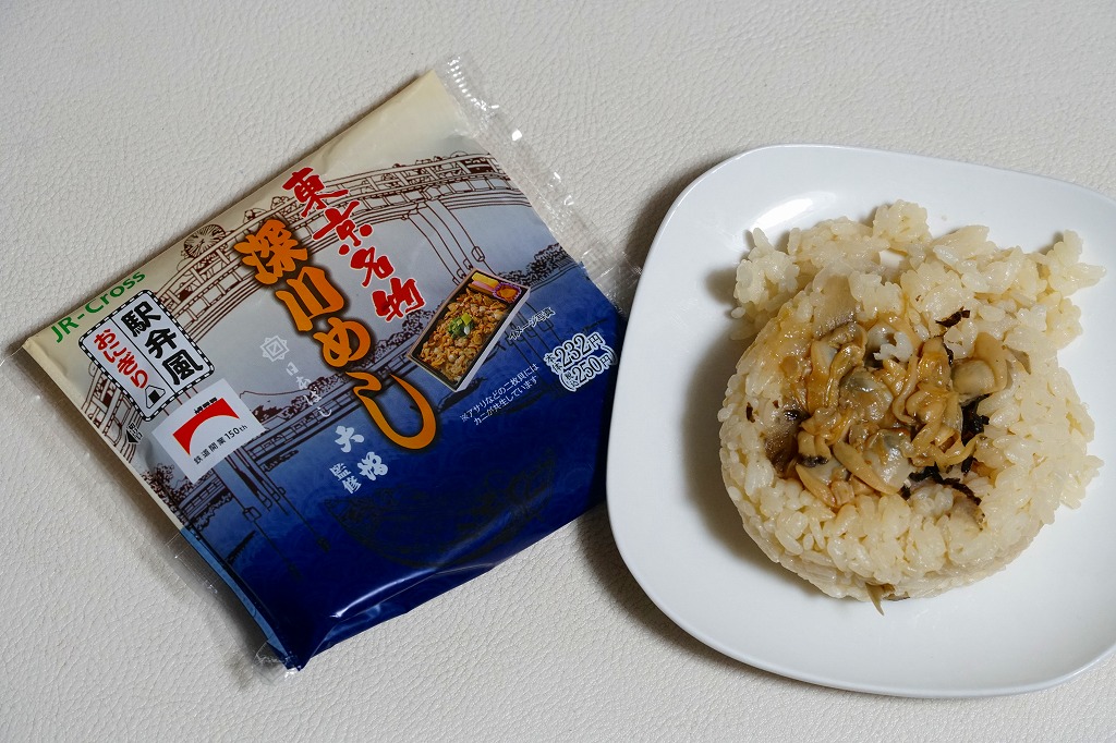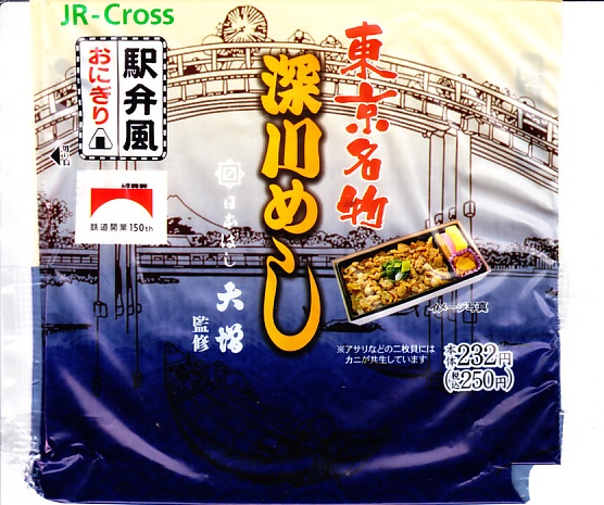 これは東京駅弁の日本ばし大増が監修し、埼玉県のJR東日本クロスステーションが製造し、駅のコンビニで販売する、自社完結の企画商品。駅弁の深川めしのふたと同じ絵柄の袋に、アサリの深川煮とごぼうの炒り煮を具としたアサリ風味御飯のおにぎりを詰める。油で崩壊し食べにくくも、油の風味を含めた駅弁の御飯の味が詰まっていた。