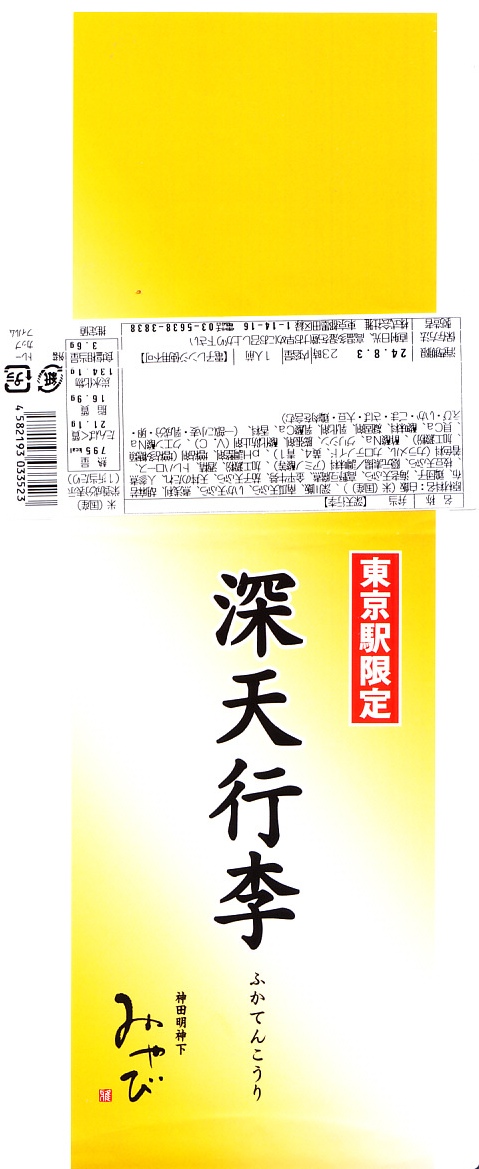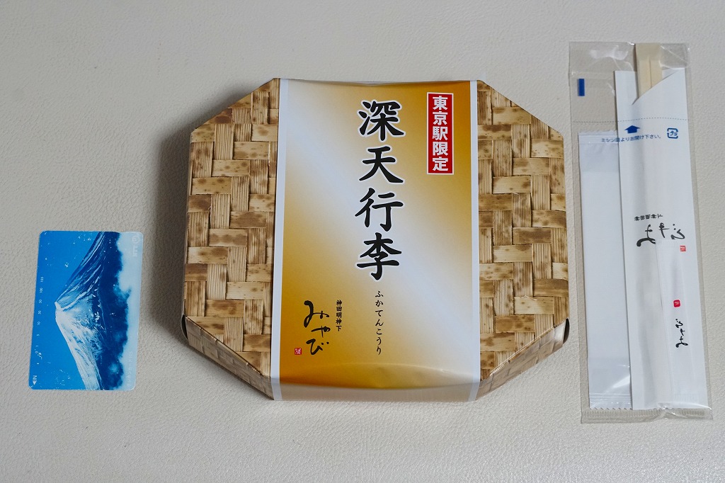 ここでは東京駅の地下食品売り場で期間限定の出店を繰り返す「神田明神下みやび」のブランドで、東京駅限定を名乗り売られるお弁当。この名前と内容の弁当は、2019(令和元)年までに発売し、同年6月以降に東京駅でも断続的に販売か。同社の「The東京幕の内」などのお弁当は、普段からキヨスク系の店舗「膳まい」のち「HANAGATAYA」で買える。
