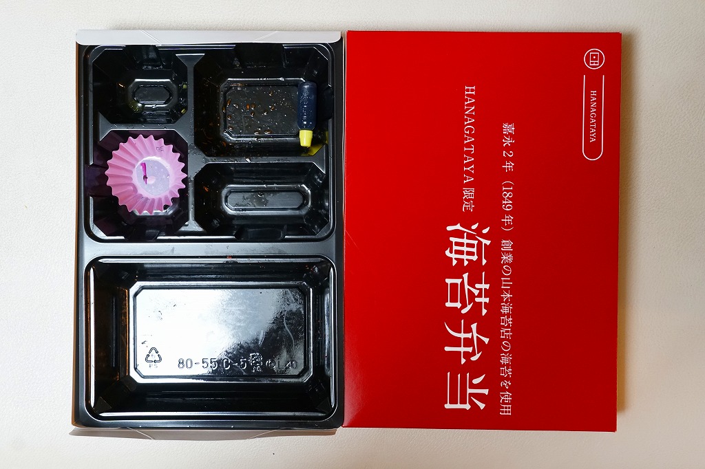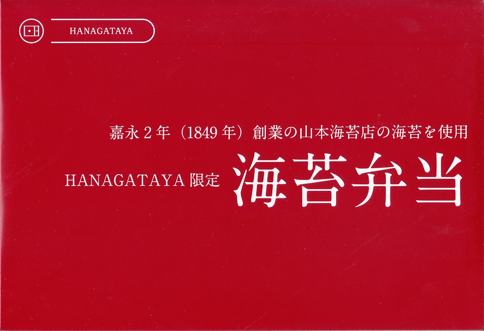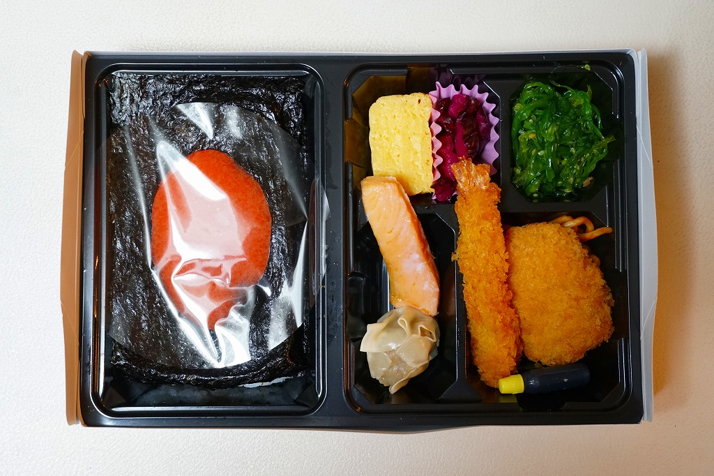 2020(令和2)年3月14日に、「一流料理人が作るバリュー弁当」の触れ込みで、「幕の内弁当」「焼肉弁当」「ハンバーグ弁当」とこの「海苔弁当」の4種類が、赤いパッケージと940円で発売されたもの。これは「寛永2年(1849年)創業の山本海苔店の海苔を使用」なのだとか。海苔で覆って明太子を流した白飯に、野菜コロッケ、エビフライ、スパゲティ、焼売、玉子焼、焼鮭、ごまわかめ、柴漬けを添える。ハンバーグ弁当以外の調製元は同じで、中身もだいたい同じの幕の内風弁当。2021年で終売か。