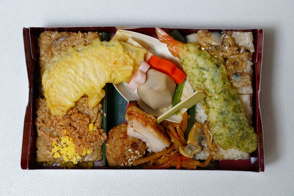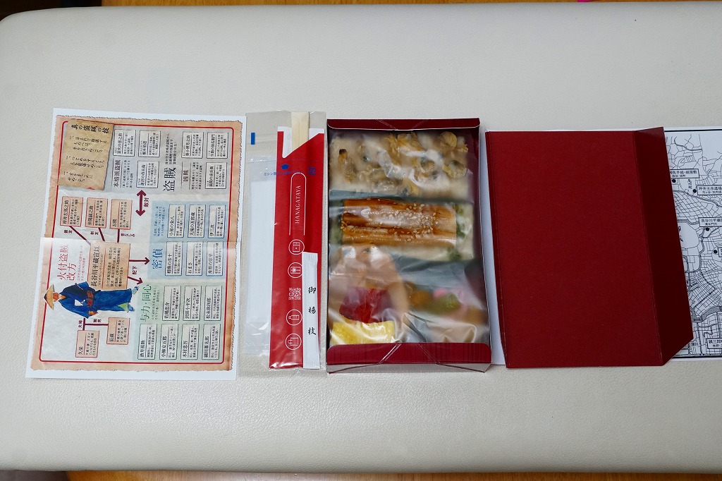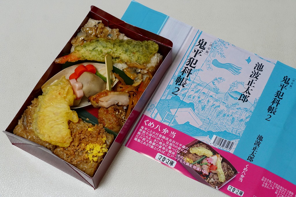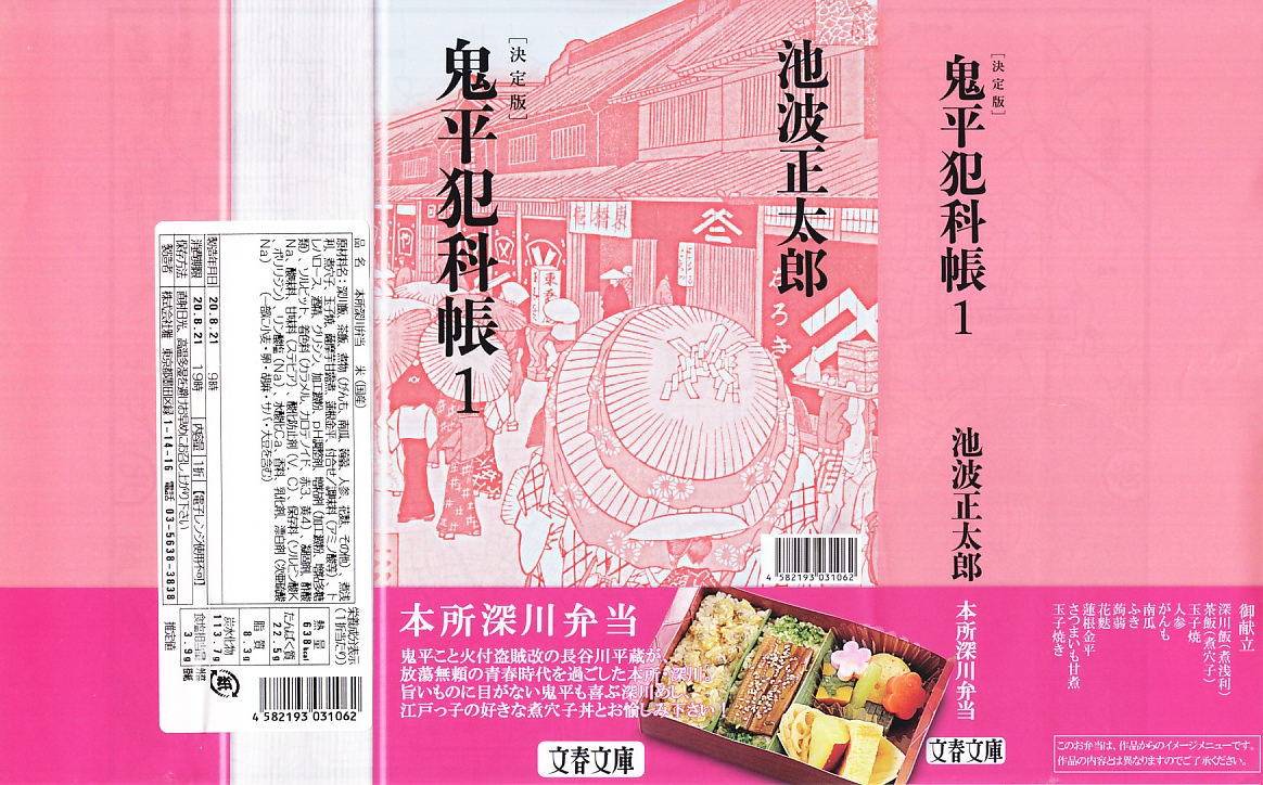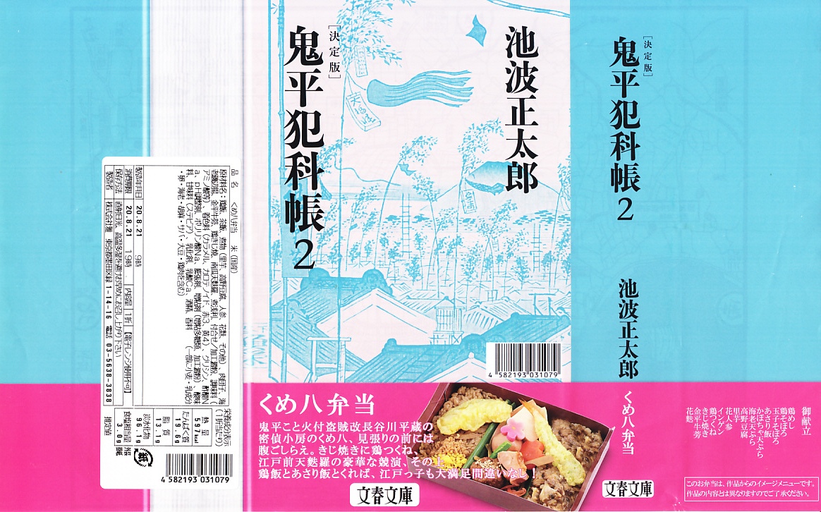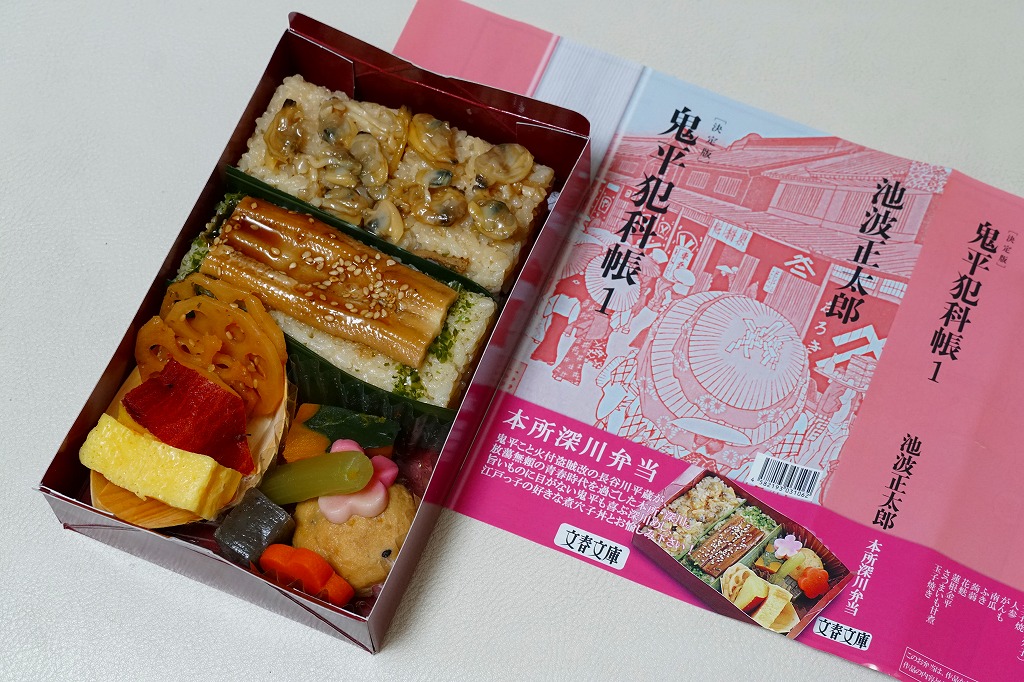 この「1」は「本所深川弁当」の名前が付き、その掛紙には文庫本の「鬼平犯科帳1」と同じ絵柄が使われる。裏面には「鬼平江戸全図」なる作品の舞台の地図があり、登場人物の相関図を別添する。中身は深川飯とするアサリ飯、江戸っ子の好きな煮穴子丼と記すアナゴ飯、煮物などのおかず。文庫本は全24巻なので、そこまでシリーズ化するのだろうか。2021年3月に「3」と「4」が出たので終売。