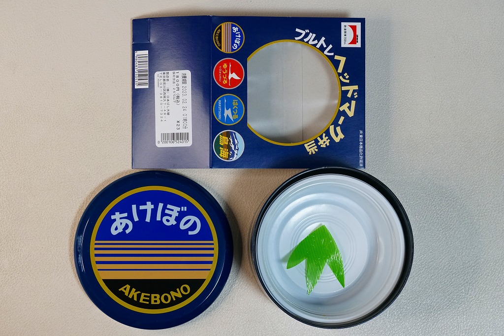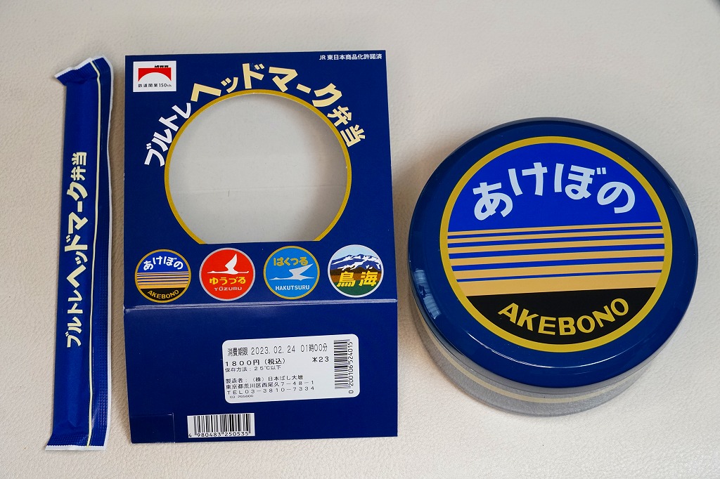 2023(令和5)年2月16日に、スリーブと中身と値段が同じ「あけぼの」「ゆうづる」「はくつる」「鳥海」の4種類が突然に登場。これは「あけぼの」で、かつて上野駅と青森駅を奥羽本線のち羽越本線経由で結んだ寝台特急列車「あけぼの」のヘッドマークが、丸いプラ容器に描かれる。それ以外は上記の「はくつる」と同じ。売り場では4種類が山盛りで客を待っていた。