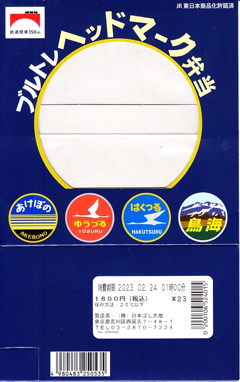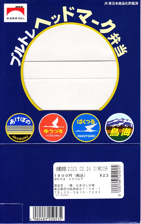 2023(令和5)年2月16日に、スリーブと中身と値段が同じ「あけぼの」「ゆうづる」「はくつる」「鳥海」の4種類が突然に登場。販売元のJR東日本クロスステーションのツイッターは「鉄道開業150周年の最後を飾り、2月16日(木)数量限定発売」としたが、告知も時期も弁当の現物も、やっつけ仕事か突貫作業を感じる。東京駅の駅弁売店「駅弁屋 祭」「駅弁屋 踊」に加えて、大宮駅「駅弁屋旨囲門」と鉄道博物館でも販売したそうな。