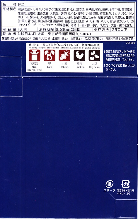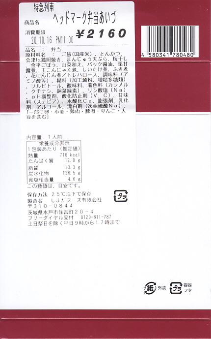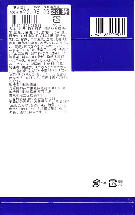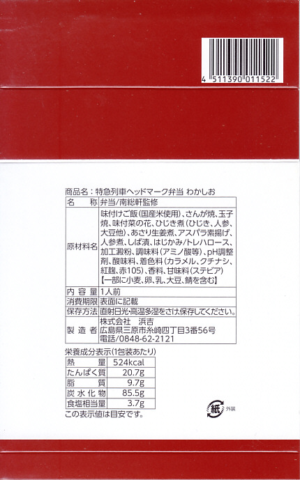 ところでこの駅弁、スリーブには千葉県の安房鴨川駅の駅弁屋「南総軒」の文字があるものの、調製元は遠く広島県の福山駅の駅弁屋「浜吉」となっている。このシリーズは駅弁屋そのものが調製しない商品が過去に何度か出ているものの、今回はどうしてこうなったのか、わけがわからない。
