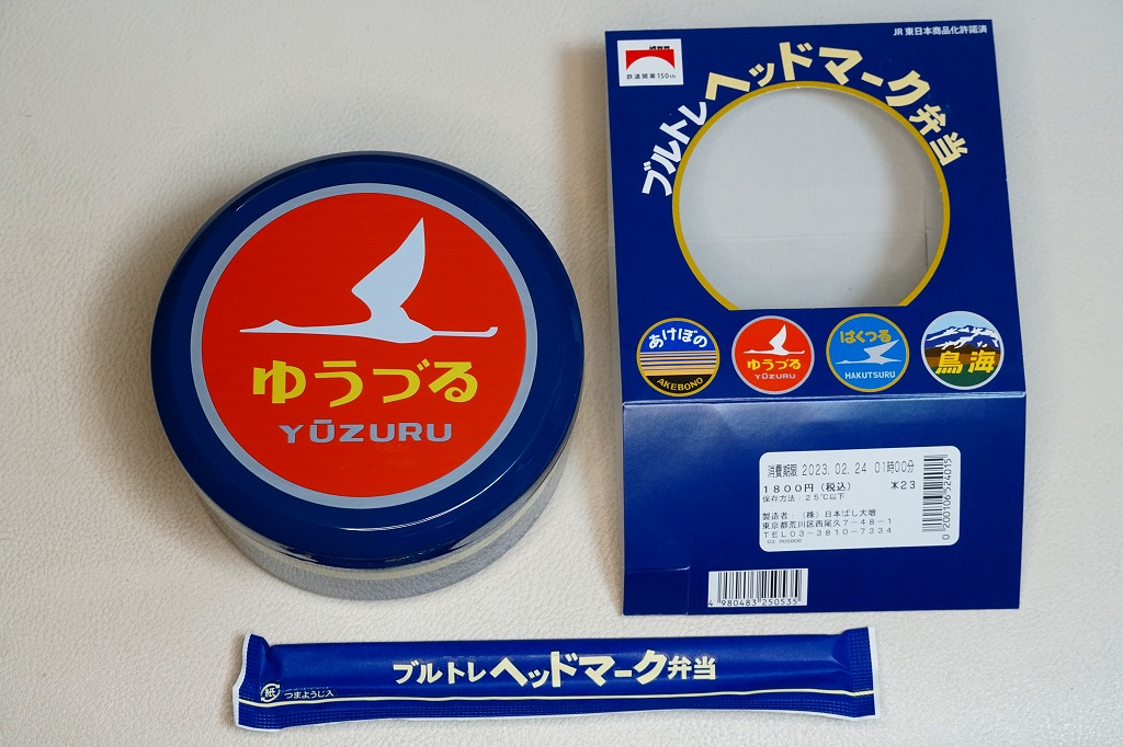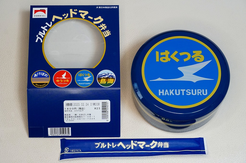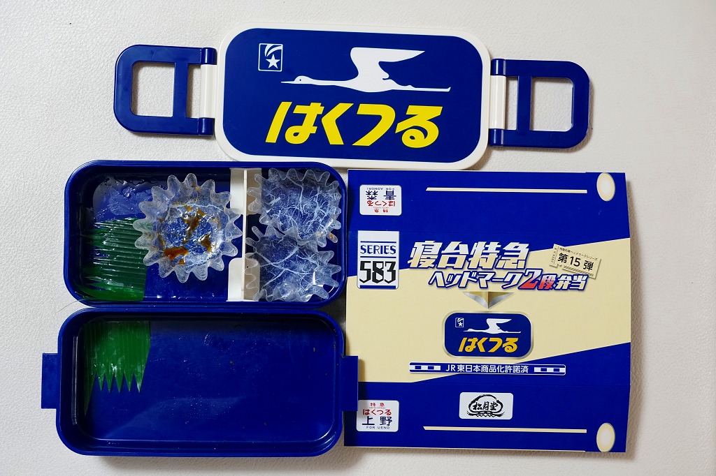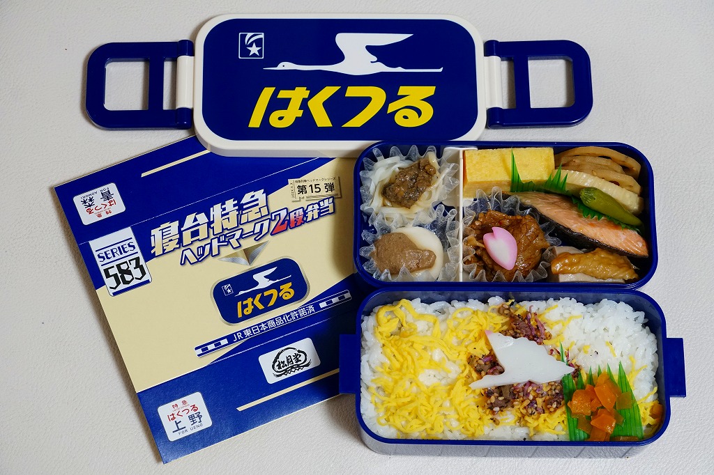 2022(令和4)年3月25日にJR東日本クロスステーションが、東京、上野、蒲田、大宮の各駅の弁当売店「HANAGATAYA」などで発売した、特急列車ヘッドマーク弁当の第15弾。前回の第14弾「みちのく」に引き続き、二段重ねのプラ容器、スケーター株式会社の「ロック式2段ランチボックス」に、今回は寝台特急はくつるのヘッドマークをプリントした。