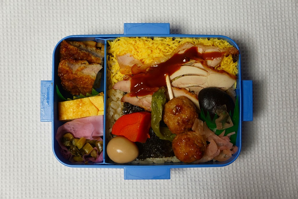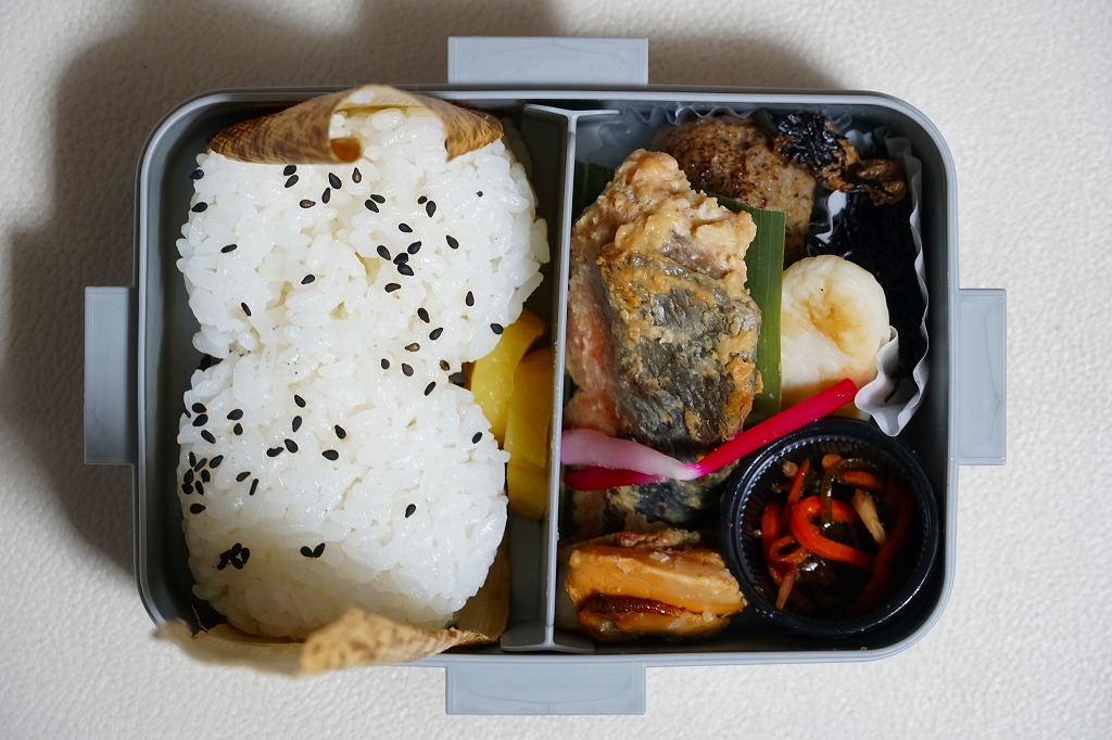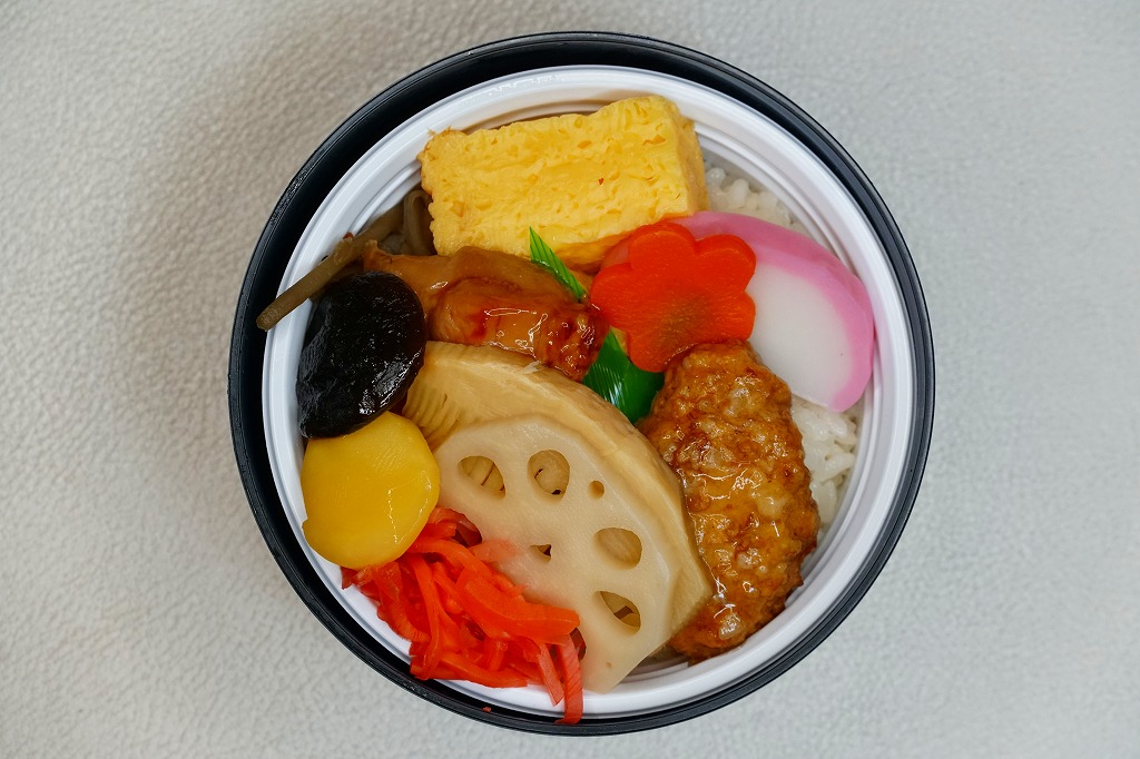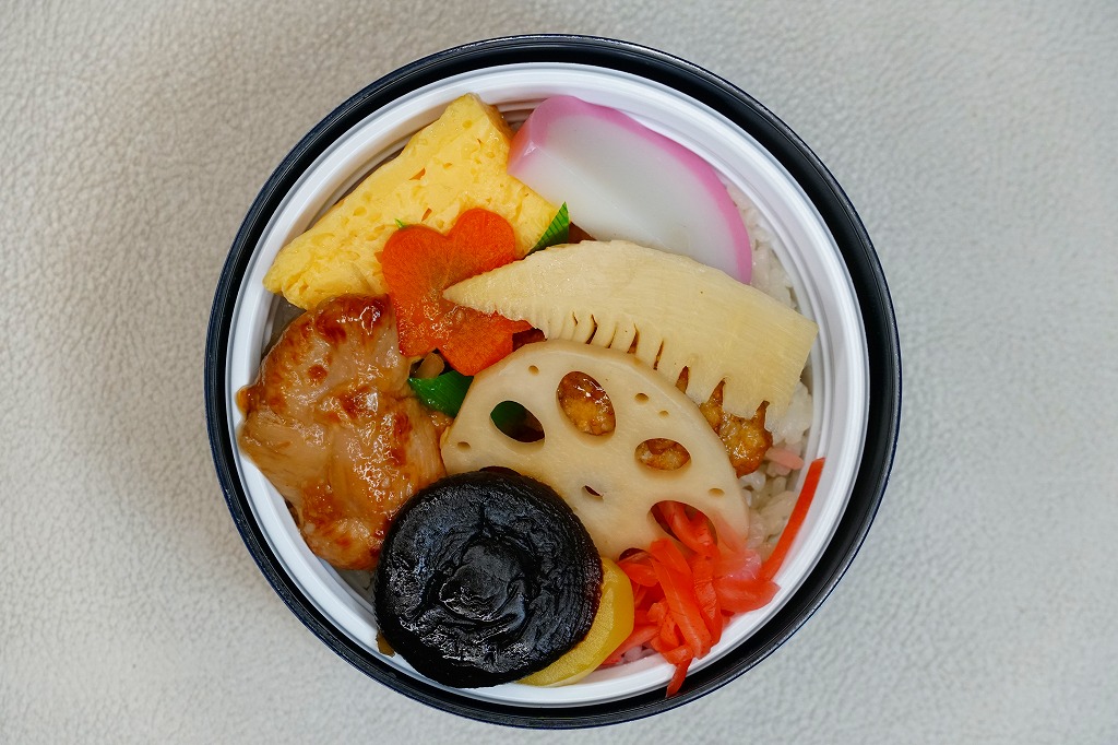 これは「はくつる」で、かつて上野駅と青森駅を東北本線経由で結んだ寝台特急列車「はくつる」のヘッドマークが、丸いプラ容器に描かれる。この容器に直でなくプラ製カップに茶飯を詰め、鶏つくね、鶏照焼、玉子焼、かまぼこ、きんぴらごぼう、くり、タケノコ、しいたけ、れんこん、にんじん、紅生姜を折り重ねる。この内容にも、味わいを見いだせなかった。3月末までの販売か。