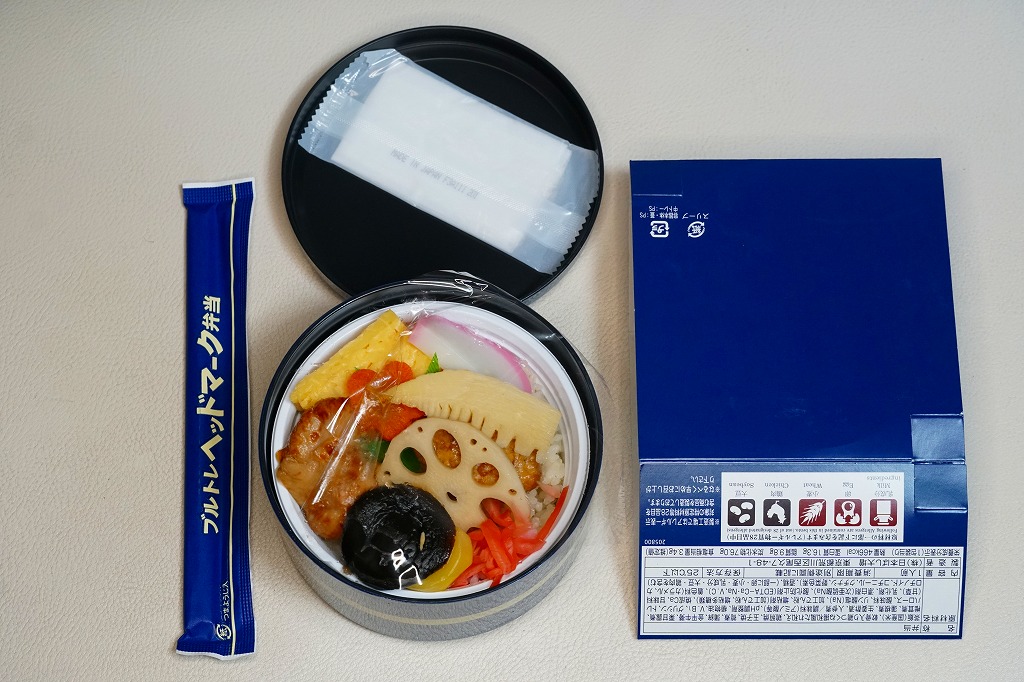 今回の中身は「沿線の名物をイメージした献立を彩り豊かに盛り込みました。」といい、東京の深川風あさり煮、愛知の名古屋名物味噌かつ、京都のきつねご飯と京風焼き湯葉の煮物、大阪のたこ焼き風たこ団子など。神戸で駅弁になった油揚げ御飯の、いなりずしとはひと味違う柔らかな口当たりと水気の豊かさが印象的。調製元は神戸駅弁の淡路屋で、しかし神戸でなく東京都足立区に設けた東京工場での調製。7月には終売か。