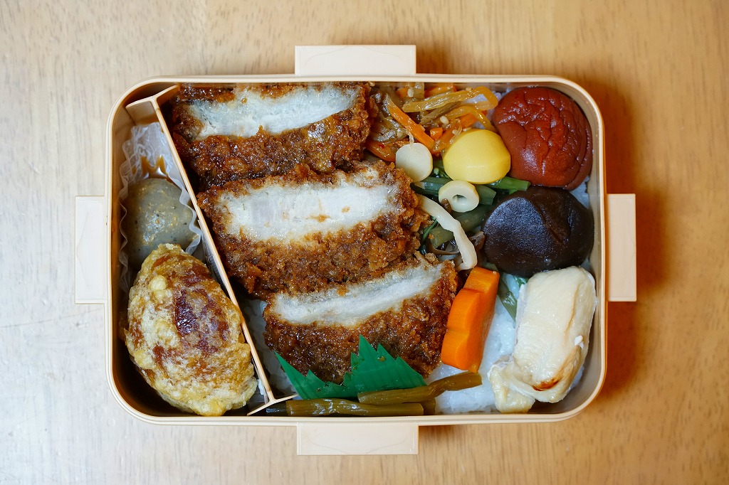 今回の中身は、福島県産コシヒカリの白飯を、ソースカツ、山菜、きんぴら、梅干し、椎茸、会津地鶏の照焼きで覆い、まんじゅうの天ぷらと味噌田楽を添えた。中身は福島なのに、なぜか調製元は福島とも「あいづ」の運転区間とも関係のない、茨城県は水戸駅弁のしまだフーズ。沿線で作ったり監修してくれる駅弁屋は、なかったのだろうか。福島や会津の名物で、古くは福島駅の駅弁にもなっていたソースカツ丼ではない、トンカツ弁当。まんじゅうの天ぷらを除き、普通に食べられる。半年間ほどの販売か。