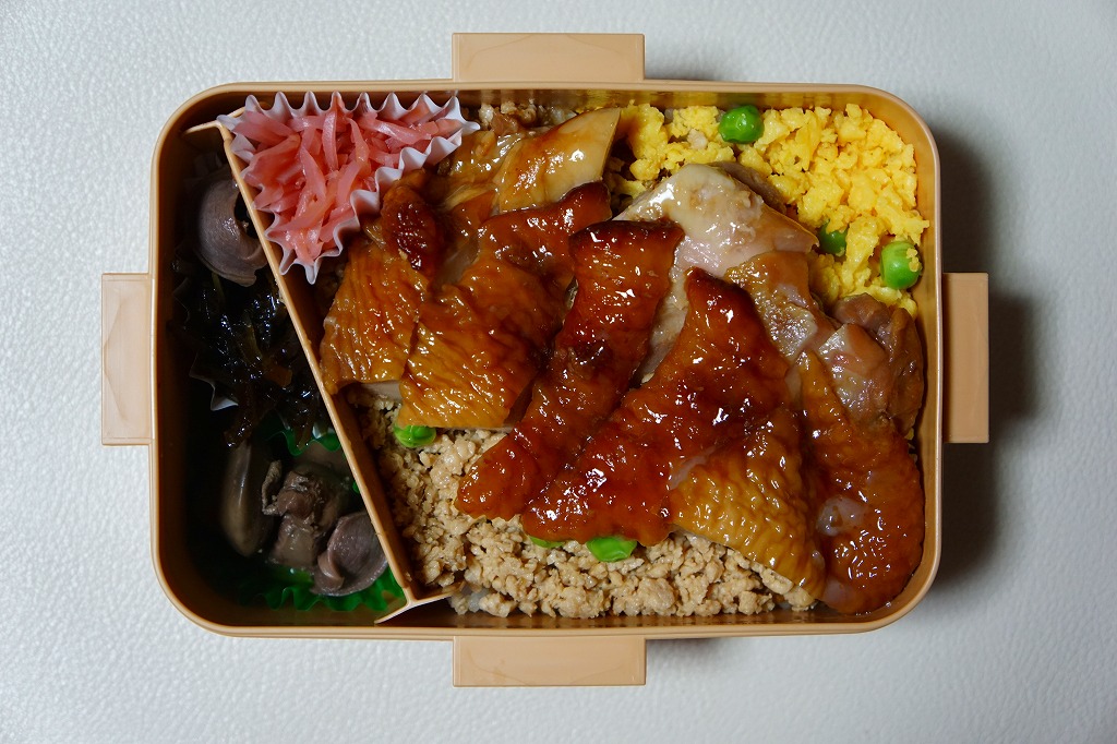 今回の中身は鶏飯で、群馬県の横川駅の駅弁屋が監修。白飯をおかか、鶏そぼろ、玉子そぼろ、鶏照焼で覆い、紅生姜、グリーンピース、昆布佃煮、鶏もつ煮を添付。横川駅の名物駅弁「峠の釜めし」の具が多く取り入れられたが、味はそれと違い、脂と水気が乗っていた感じ。調製元はなぜか、成田空港のケータリング会社。第1弾の下記「ひばり」も、同じ売店で併売されていた。