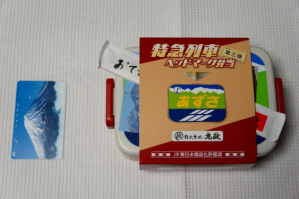 2017(平成29)年12月15日にJR東日本リテールネットが、東京、品川、上野、大宮、蒲田の各駅の弁当売店「膳まい」と甲府駅で発売した、特急列車ヘッドマーク弁当の第3弾。新宿駅などと松本駅などを結ぶ特急列車「あずさ」で、2002(平成14)年に定期列車ではみられなくなったヘッドマークの絵柄を、弁当箱の上面に印刷した。