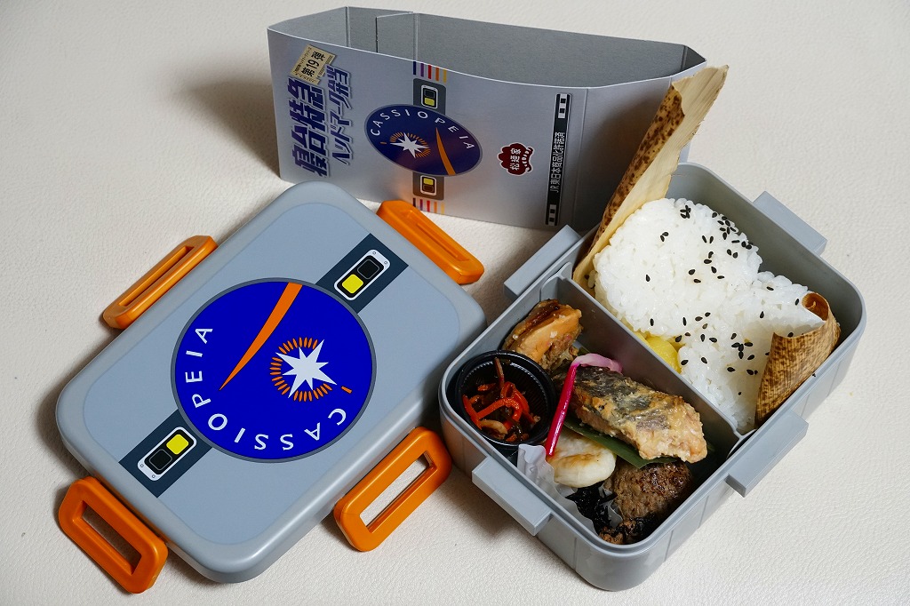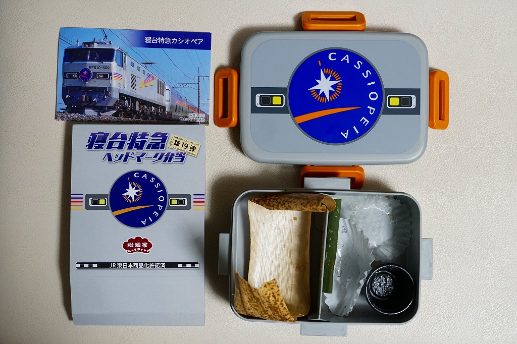 2025(令和7)年7月28日にJR東日本クロスステーションが、東京、上野、蒲田、大宮の各駅の売店「HANAGATAYA」で発売した、特急列車ヘッドマーク弁当シリーズの第19弾。前年10月の「北陸」以来、約9か月ぶりの新作。スケーター株式会社のプラ容器「4点ロックランチボックス」を引き続き使い、2016年3月まで上野駅と札幌駅を結んだ臨時寝台特急列車「カシオペア」のヘッドマークの絵柄を、スリーブと弁当箱の上面に印刷した。