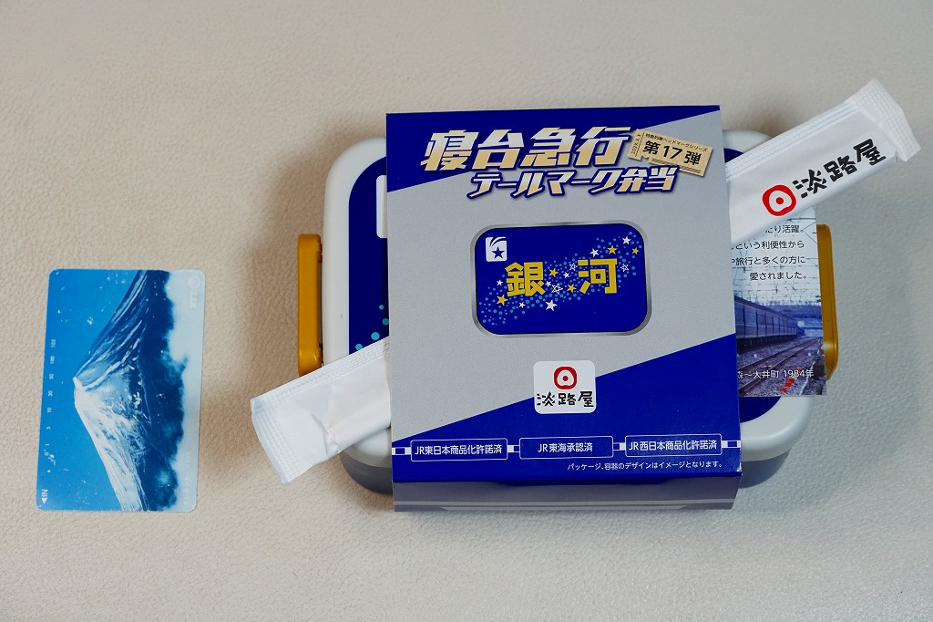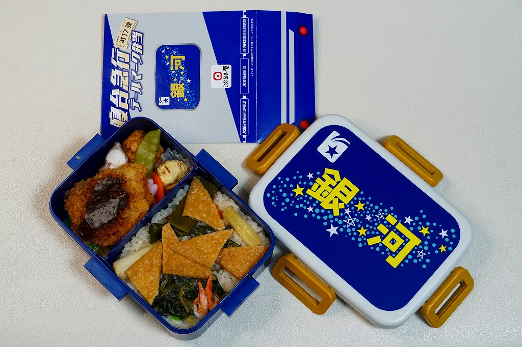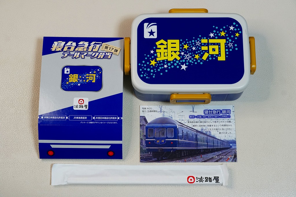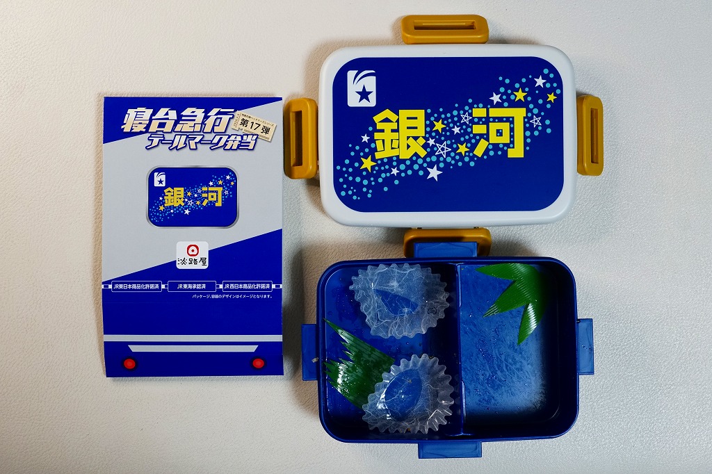 2023(令和5)年6月1日にJR東日本クロスステーションが、東京、上野、蒲田、大宮の各駅の売店「HANAGATAYA」で発売した、特急列車ヘッドマーク弁当シリーズの第17弾。前年7月の「やまびこ」以来、10か月半ぶりの新作。今回は価格を170円上げ、スケーター株式会社のプラ容器「4点ロックランチボックス」を引き続き使い、2008年3月まで東京駅と大阪駅などを結んだ寝台急行列車「銀河」のテールマークの絵柄を、弁当箱の上面に印刷した。