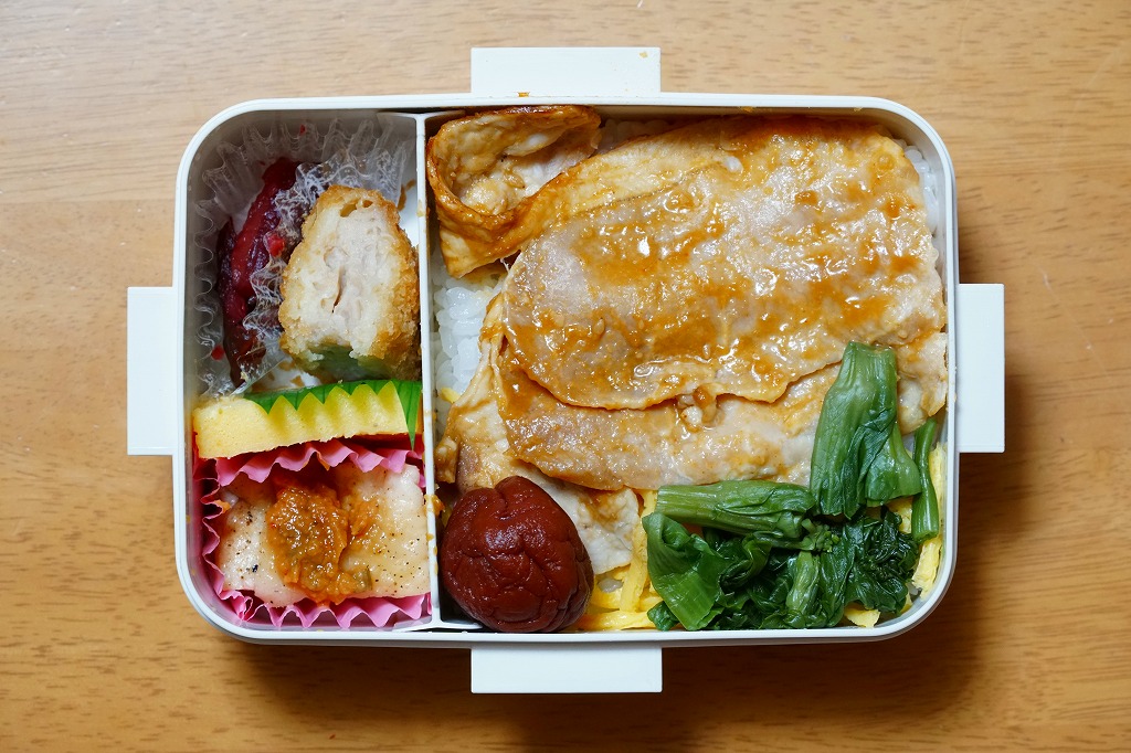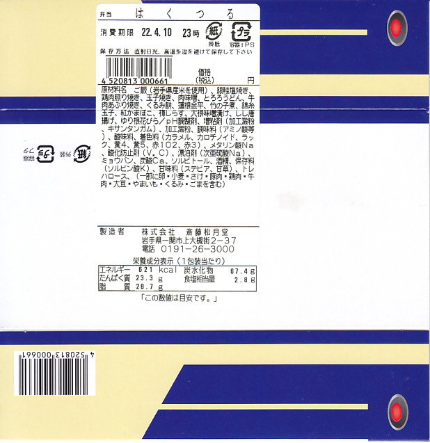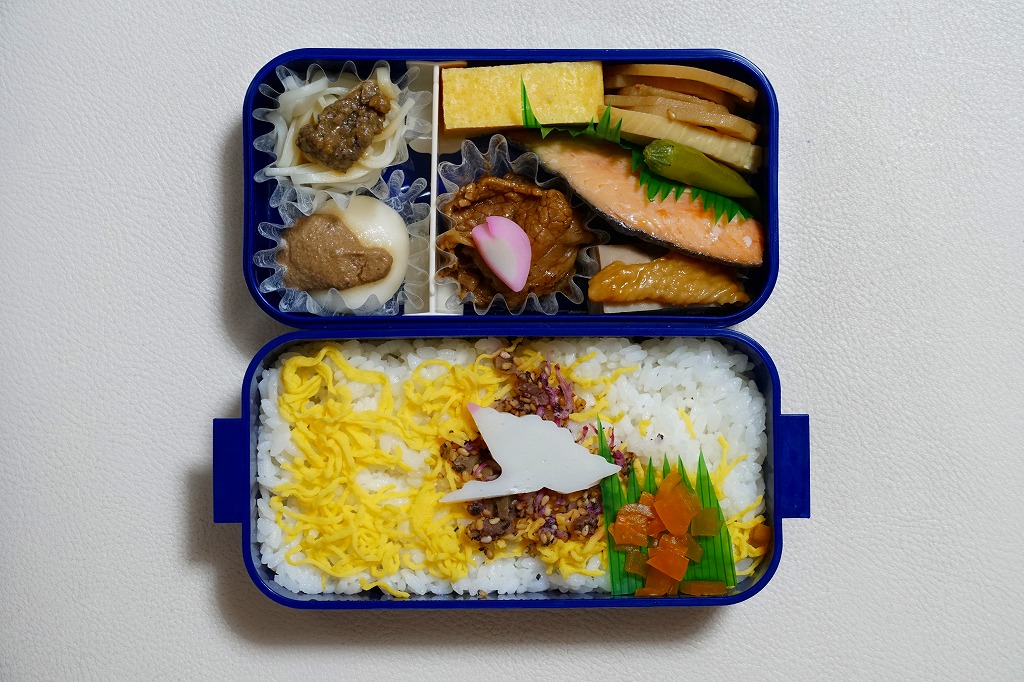 今回の中身は、下段が御飯で岩手県産ひとめぼれの白飯に少量の錦糸卵と刻み梅と大根味噌漬を添え、はくつる型のかまぼこを据えたもの。上段がおかずで盛岡じゃじゃ麺風、一関名物くるみ餅、岩手県産黒毛和牛あぶり焼き、銀鮭塩焼き、岩手県産鶏の照り焼き。調製元は岩手県は一ノ関駅の駅弁屋であり、岩手県の味や食材が詰まる。5月までの販売か。