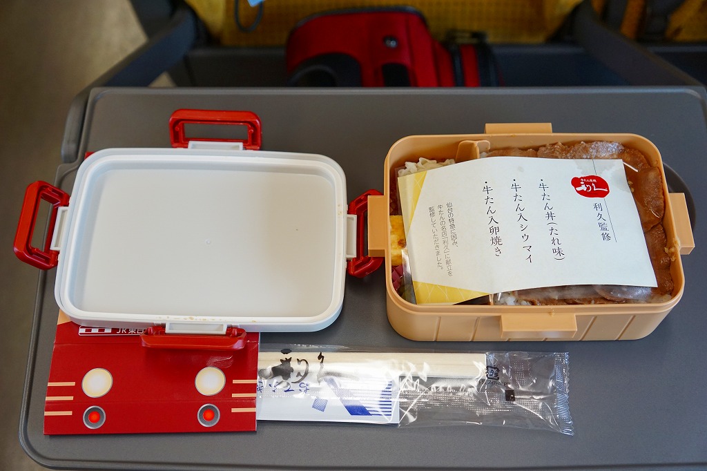 今回の中身は牛たん弁当で、仙台発祥で全国展開する牛たんチェーン店の調製。麦入り白飯を牛たん焼4枚で覆い、牛たん入り焼売、牛たん入り玉子焼、青菜刻み漬けを添えた。小学生サイズのプラ製弁当箱と、米沢駅弁の牛たん弁当のような味と中身で、価格は実に2160円。弁当箱代と駅弁代を重ねて課金された印象。