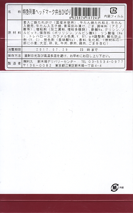 今回の中身は牛めしで、新潟駅の駅弁屋が監修。白飯を牛肉煮で覆い、マイタケとタクアンを載せ、焼鮭と煮物と菜の花を添える。新潟駅にこんな牛肉駅弁が、あったかどうか。過去の「あずさ」や「ひたち」も牛肉駅弁で、それらとあまり変わらない。箸袋は駅弁屋のものだが、調製元は「北斗星」と同じく、神奈川県横浜市の食品工場となっている。