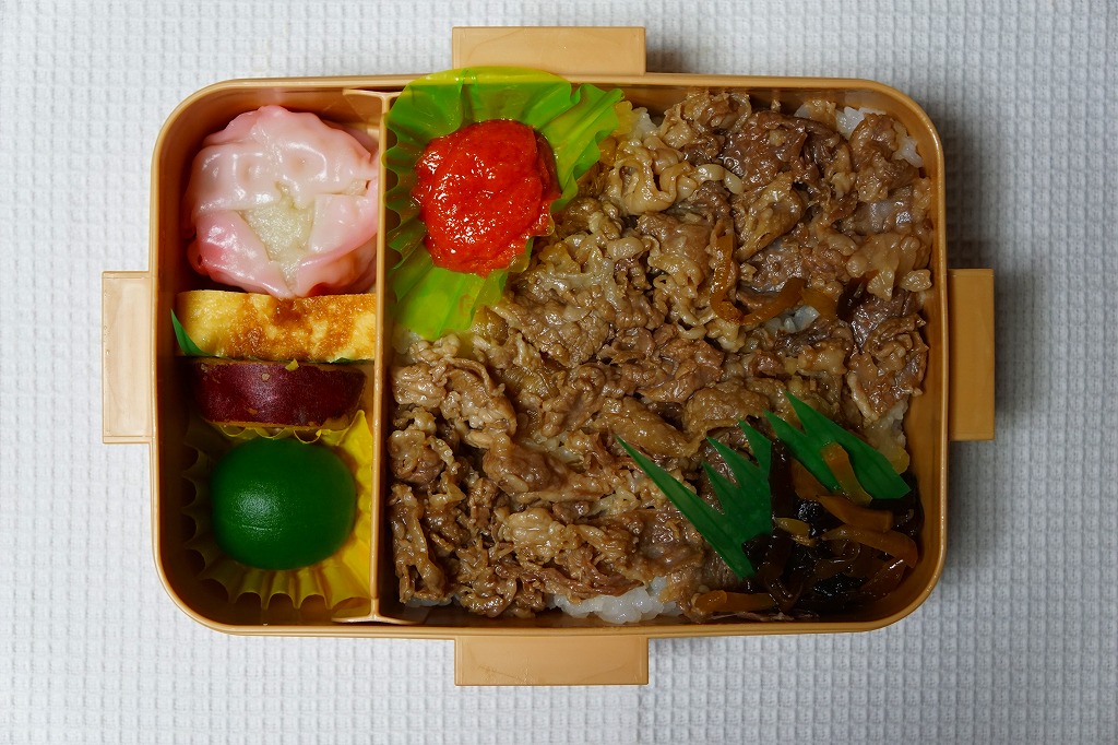 今回の中身は牛肉弁当で、山梨県の小淵沢駅の駅弁屋が調製。茶飯を牛肉煮、牛そぼろ、野沢菜、錦糸卵で覆い、甲州小梅、うずら卵、山菜、きくらげなどを添付する。そんな中身の印象は、ほとんど「牛肉どまん中」。普通の牛肉駅弁に仕上がった。