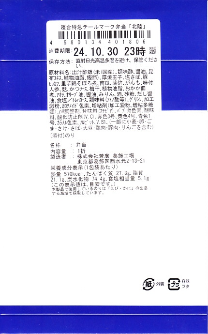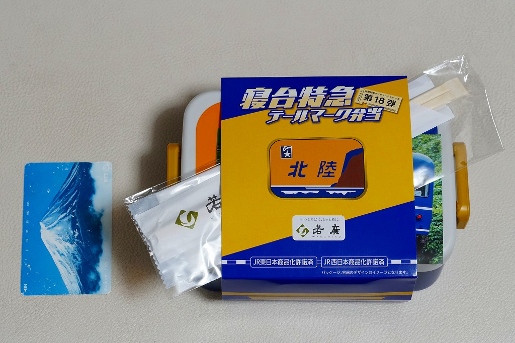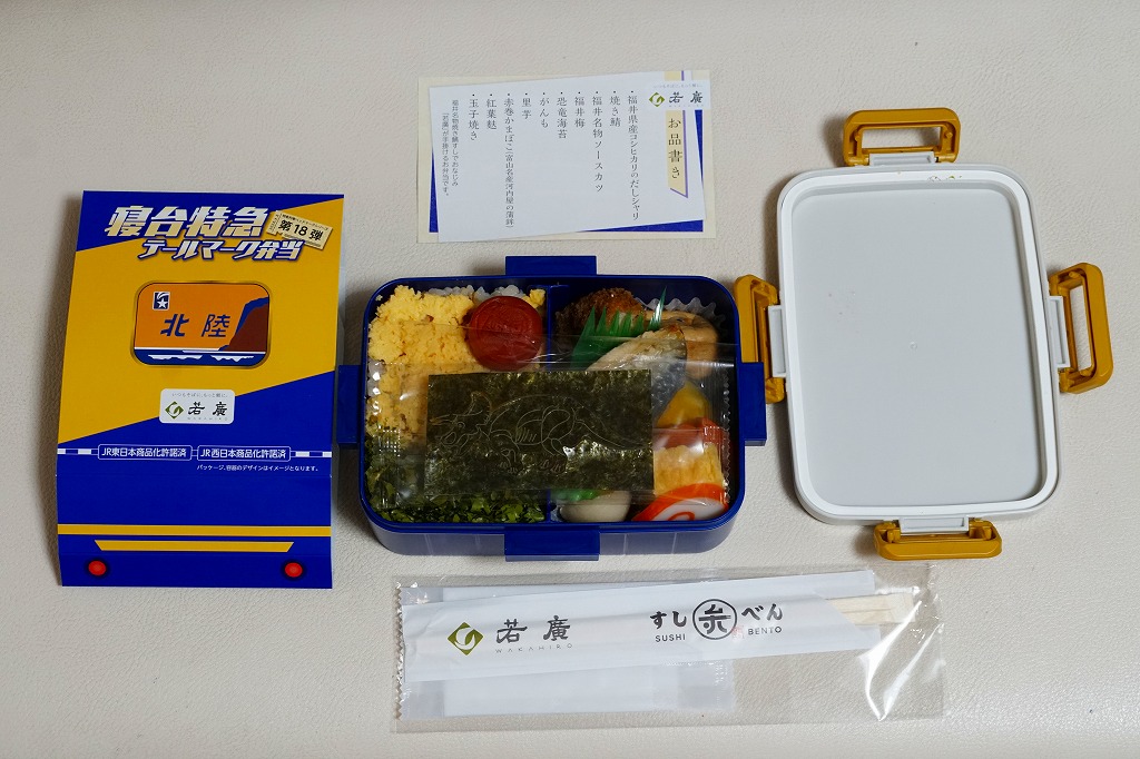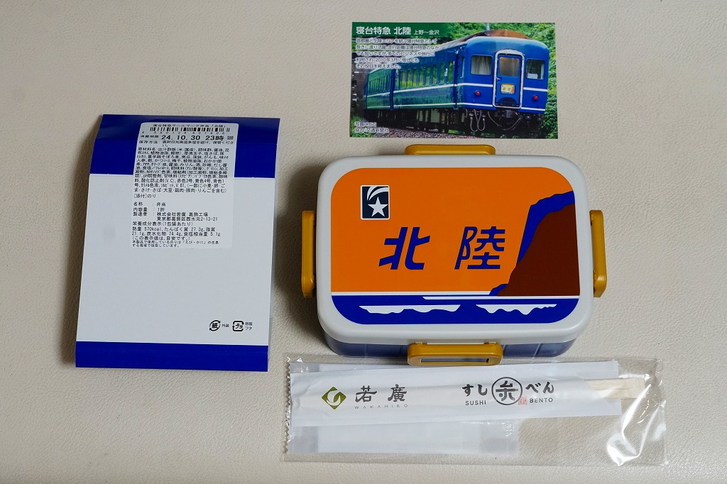 2024(令和6)年10月14日にJR東日本クロスステーションが、東京、上野、蒲田、大宮の各駅の売店「HANAGATAYA」で発売した、特急列車ヘッドマーク弁当シリーズの第18弾。前年6月の「銀河」以来、16か月半ぶりの新作。スケーター株式会社のプラ容器「4点ロックランチボックス」を引き続き使い、2010年3月まで上野駅と金沢駅などを結んだ寝台特急列車「北陸」のテールマークの絵柄を、弁当箱の上面に印刷した。