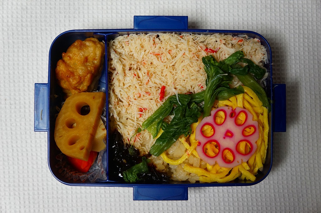 今回の中身はかにめしで、北海道の苫小牧駅の駅弁屋が監修。茶飯をカニほぐし身と菜の花と錦糸卵と花レンコンで覆い、鶏唐揚と煮物を付ける。これで北海道を表現できたかどうか。箸袋も駅弁屋のものだが、調製元は神奈川県横浜市の食品工場となっている。