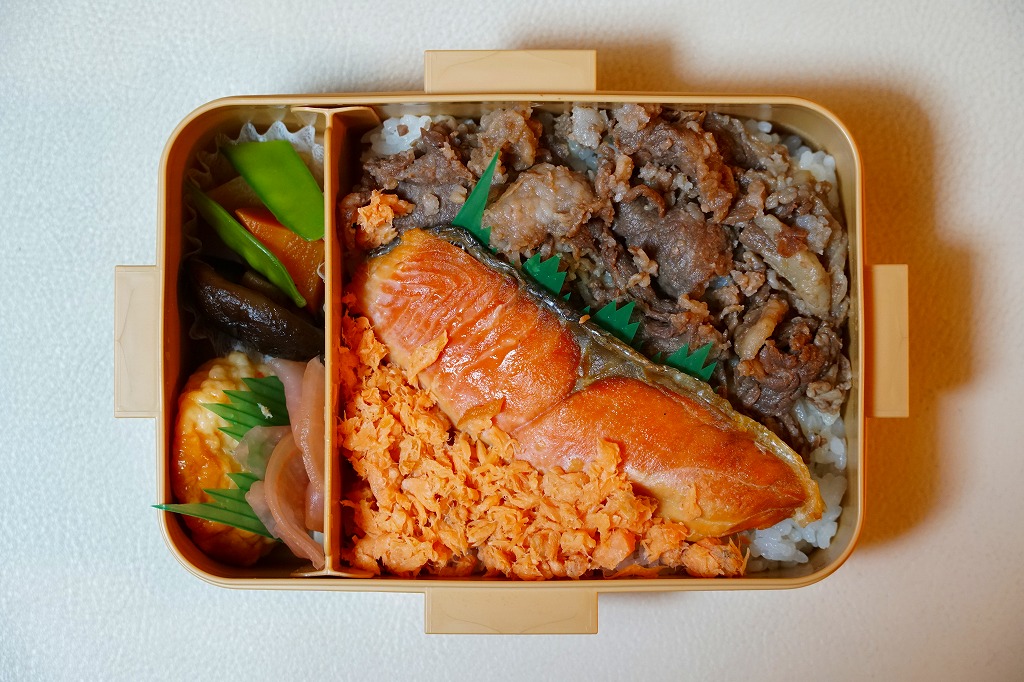 今回の中身は牛鮭飯で、新潟の駅弁で見覚えがある。新潟米コシヒカリの白飯を、鮭塩焼、鮭ほぐし、あがの姫牛のすき焼き風で覆い、海老しんじょう、タケノコやニンジンなどの煮物、大根漬を添える。調製元は今回はまともで、新津駅や新潟駅の駅弁屋。今回は百貨店への輸送のためか、密封性が高すぎる容器のせいか、鮭も肉も固結していた感じ。