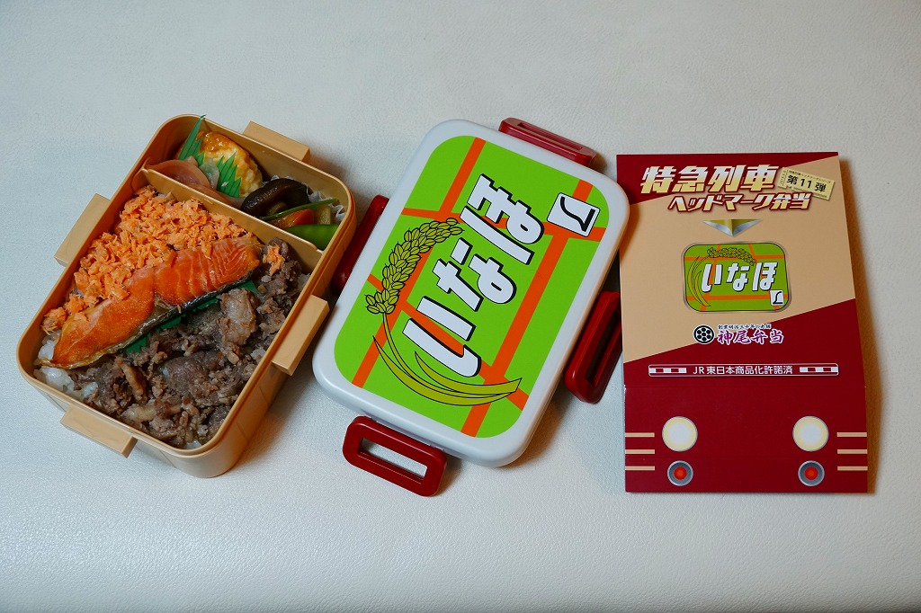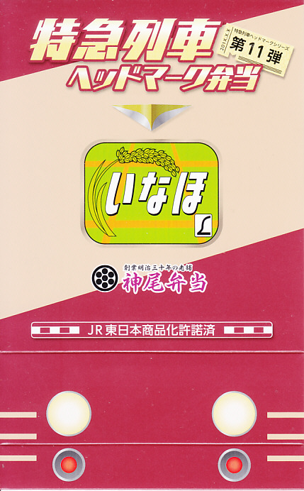 2019(令和元)年10月30日にJR東日本リテールネットが、東京、品川、上野、大宮、蒲田の各駅の弁当売店「膳まい」と新潟駅で発売した、特急列車ヘッドマーク弁当の第11弾。今回は1969(昭和44)年から上野駅と秋田駅を結び始めた在来線特急列車「いなほ」のヘッドマークの絵柄を、弁当箱の上面に印刷した。