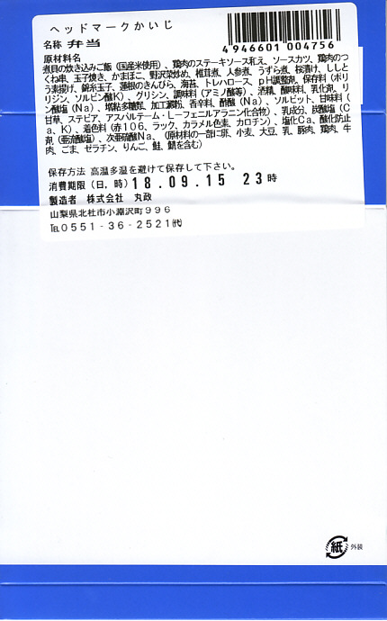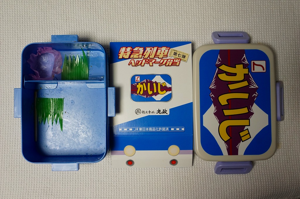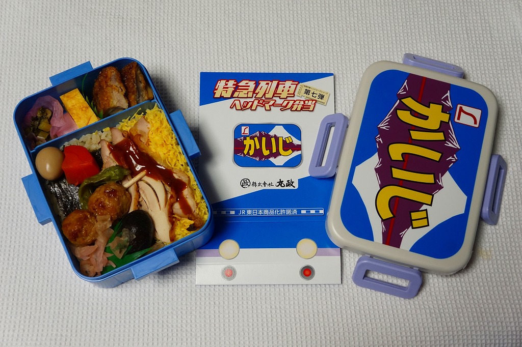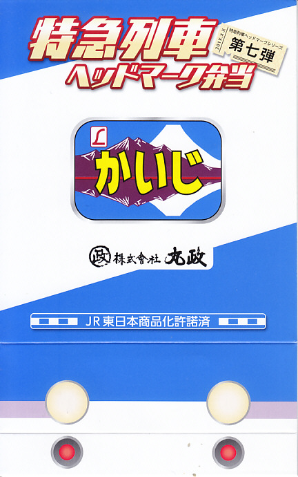 2018(平成30)年9月10日にJR東日本リテールネットが、東京、品川、上野、大宮、蒲田の各駅の弁当売店「膳まい」と新宿駅と八王子駅と甲府駅で発売した、特急列車ヘッドマーク弁当の第7弾。今回は1988(昭和63)年から新宿駅と甲府駅を結ぶ在来線特急列車「かいじ」のヘッドマークの絵柄を、弁当箱の上面に印刷した。