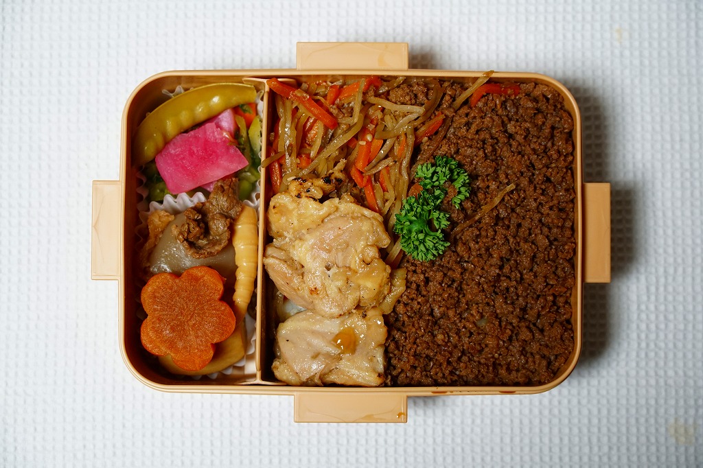 今回の中身は「牛肉どまん中」とされ、その調製元である山形県の米沢駅の駅弁屋が調製。白飯を牛そぼろ、きんぴらごぼう、鶏照焼で覆い、パセリで彩り、いも煮と漬物を添える。「牛肉どまん中」には、そんなに似ていない。