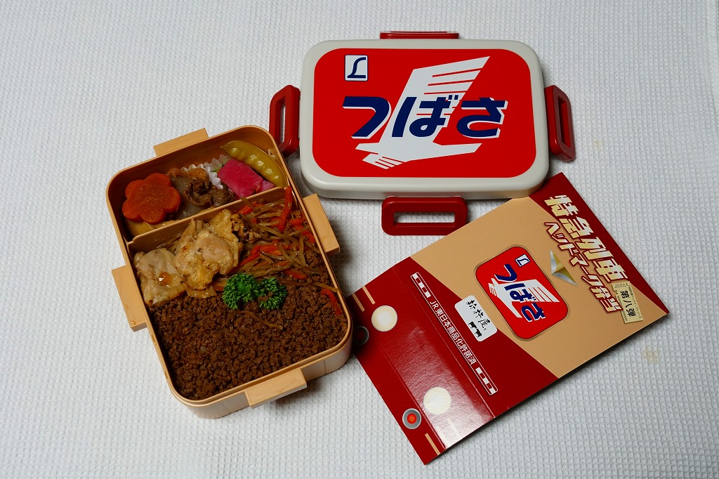 1982(昭和57)年6月の東北新幹線の大宮駅から盛岡駅での暫定開業から、1985(昭和60)年3月の新幹線の上野駅から大宮駅までの延伸開業まで、在来線の上野駅と大宮駅を結んだ列車「新幹線リレー号」のヘッドマークの絵柄を、弁当箱の上面に印刷した。中身は白飯を豚ロース味噌焼で覆い、菜の花と梅干しと錦糸卵を添え、チキンソテーとメンチカツ、玉子焼と漬物を付け合わせるもの。半月ちょっとの販売で、4月には終売か。