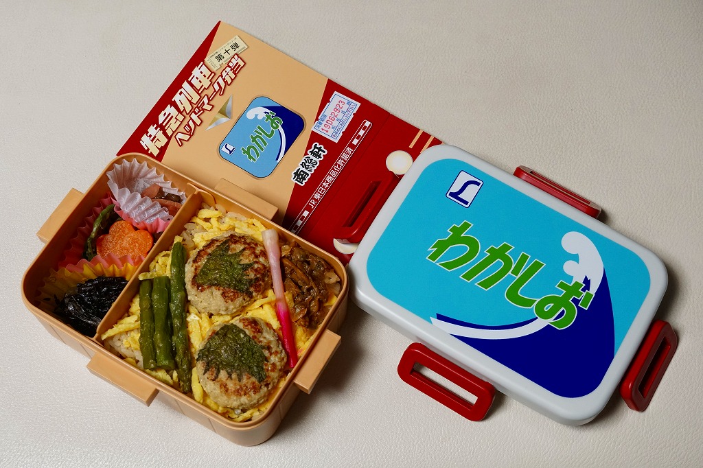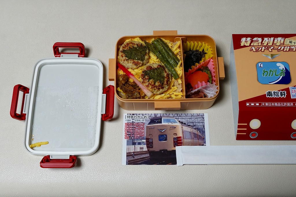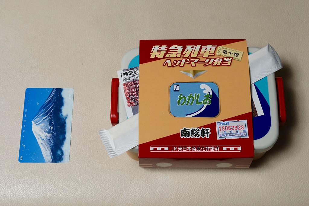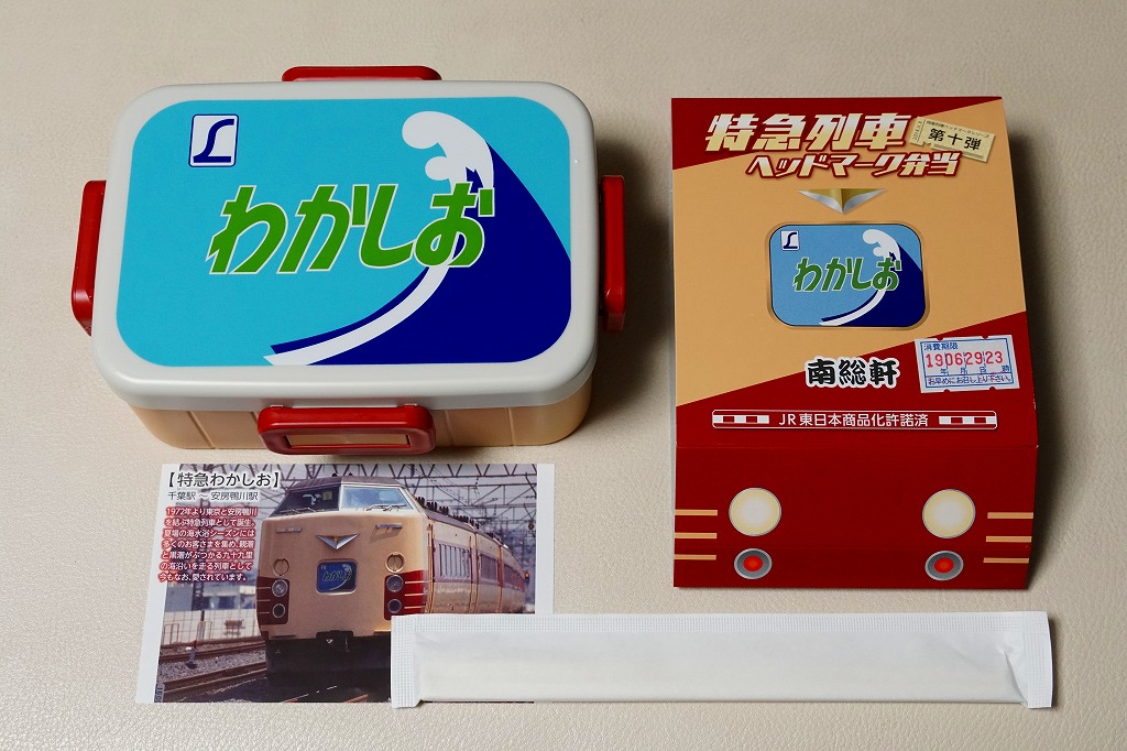 2019(令和元)年6月28日にJR東日本リテールネットが、東京、品川、上野、大宮、蒲田の各駅の弁当売店「膳まい」で発売した、特急列車ヘッドマーク弁当の第10弾。今回は1972(昭和47)年から東京駅と安房鴨川駅などを結ぶ在来線特急列車「わかしお」のヘッドマークの絵柄を、弁当箱の上面に印刷した。