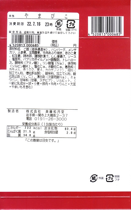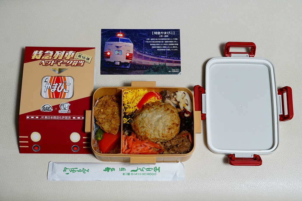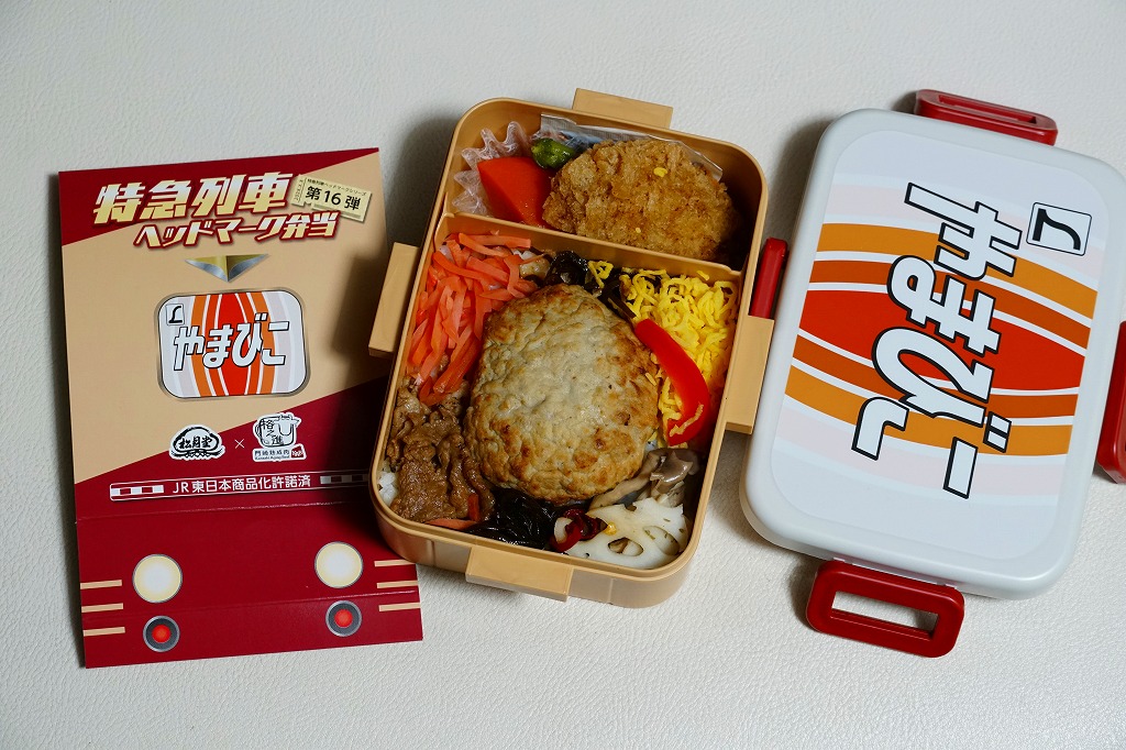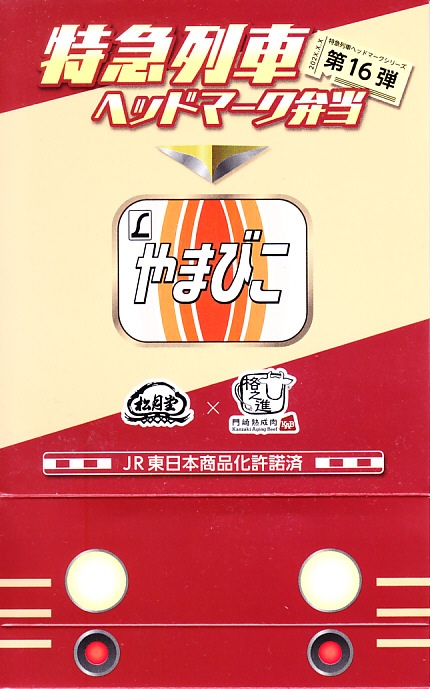 2022(令和4)年7月15日にJR東日本クロスステーションが、東京、上野、蒲田、大宮の各駅の弁当売店「HANAGATAYA」などで発売した、特急列車ヘッドマーク弁当の第16弾。今回は容器と値段を2020年10月発売の第13弾「あいづ」のタイプに戻し、その容器のふたとスリーブに特急やまびこのヘッドマークをプリントした。