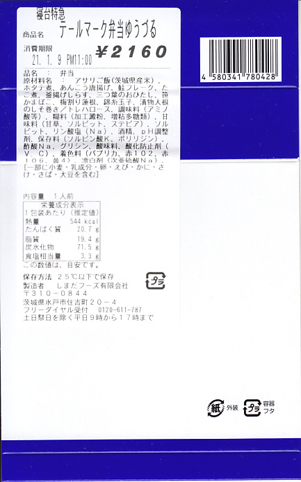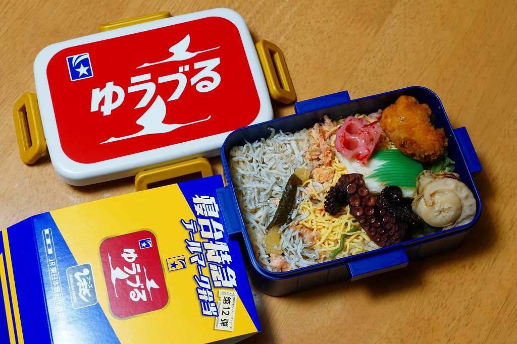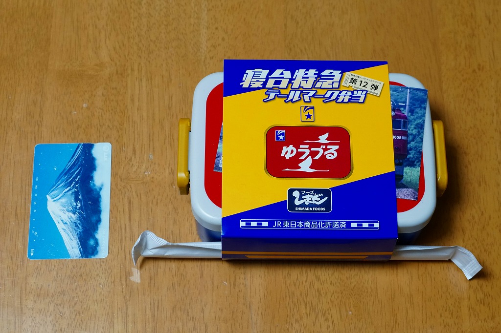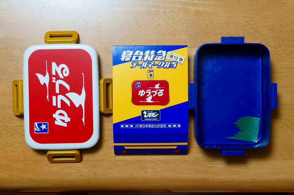 今回は1965(昭和40)年10月から1993(平成5)年11月まで、上野駅と青森駅を常磐線経由で結んだ寝台特急列車「ゆうづる」のテールマークの絵柄を、弁当箱の上面に印刷した。これに伴い表題を「特急列車ヘッドマーク弁当」から「寝台特急テールマーク弁当」に変更したのは、2018年5月発売の第5弾「北斗星」と同じ。調製元は「ゆうづる」廃止後、当時の駅弁屋の全滅後に、水戸駅に進出した駅弁屋。
