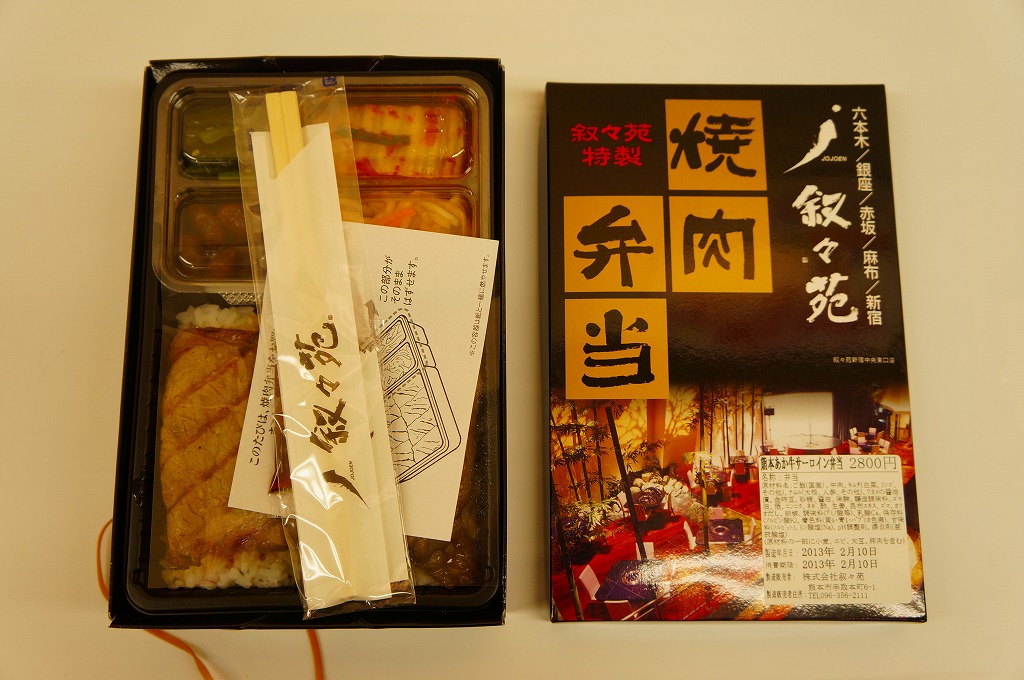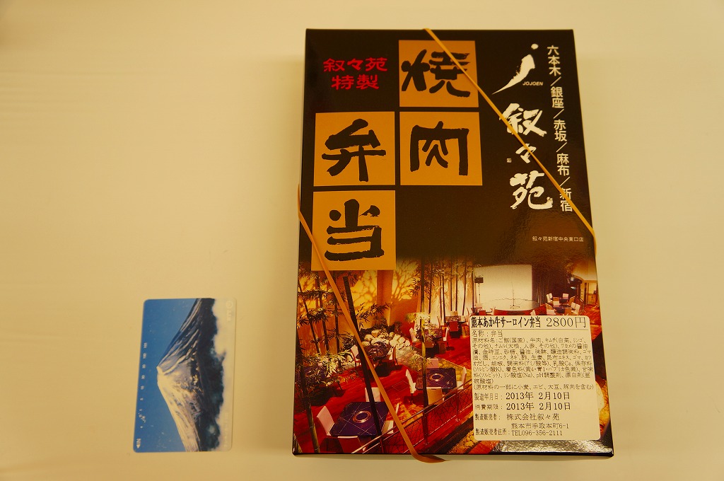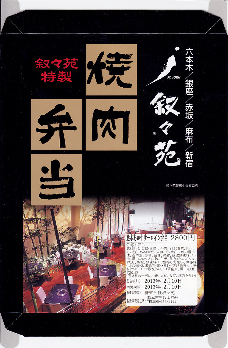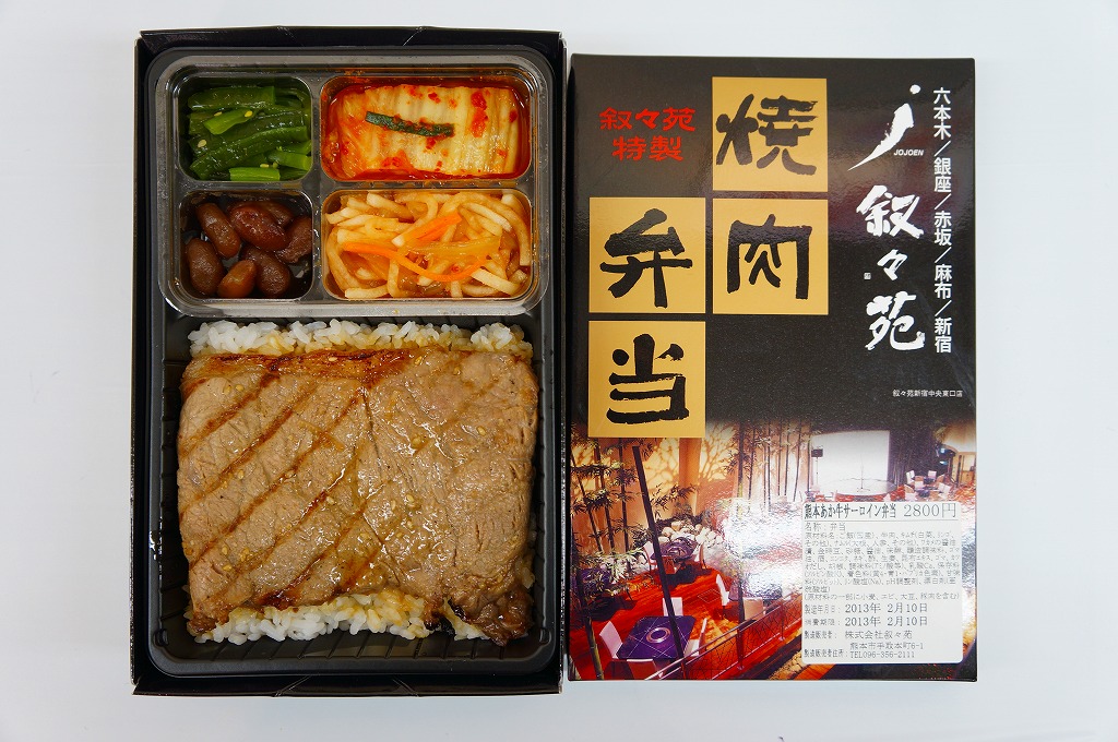 2013(平成25)年2月の鶴屋百貨店の駅弁大会で、東京駅弁「叙々苑焼肉弁当」などとともに実演販売されたお弁当。牛肉を商品名どおりの熊本あか牛サーロインの一枚物に差し替えた以外、容器や中身は東京駅弁と同じである。霜降りの脂身を味わう通常版と違い、こちらは柔らかい赤身を味わうもの。デパートでの実演販売に即し、調製元の所在地と連絡先が百貨店のそれになっている。