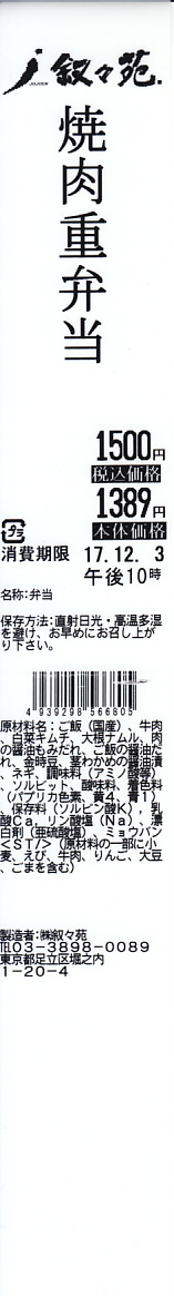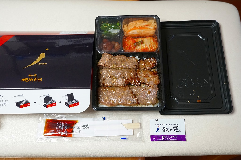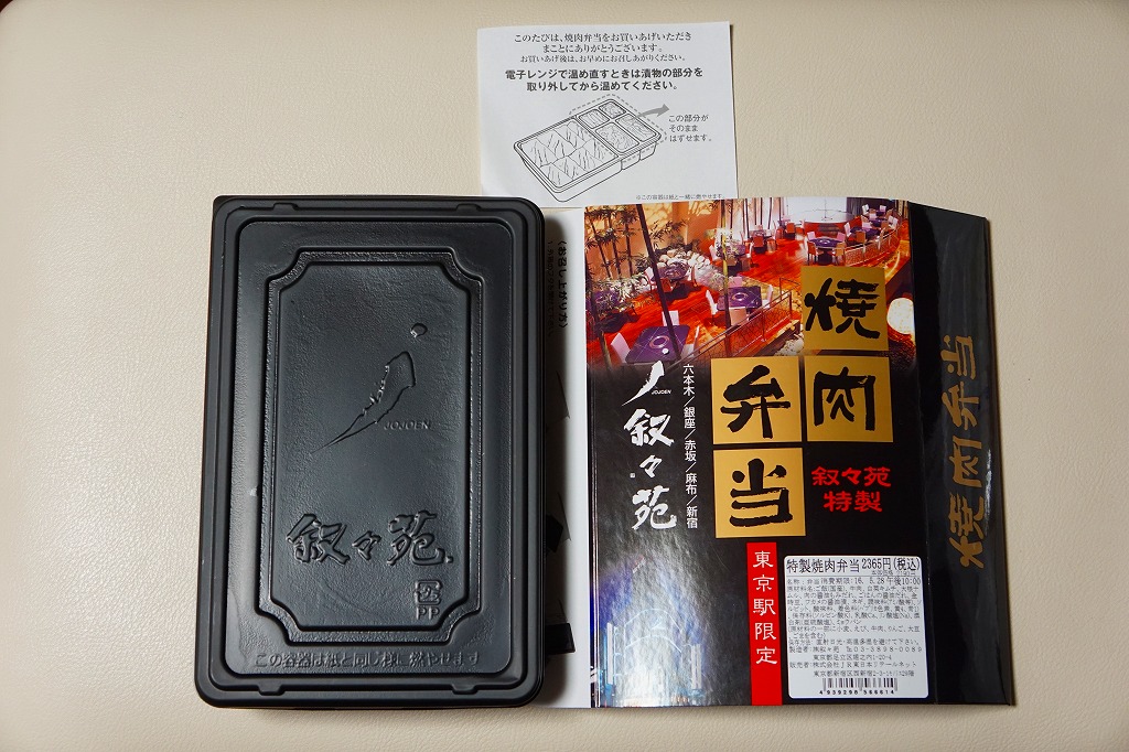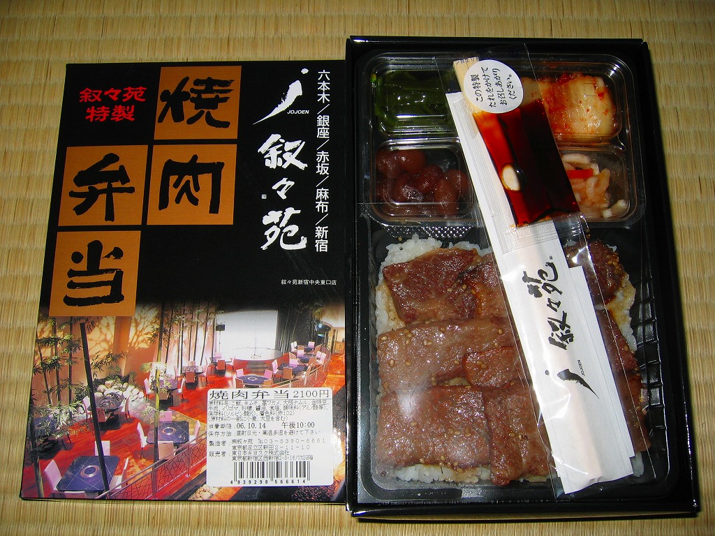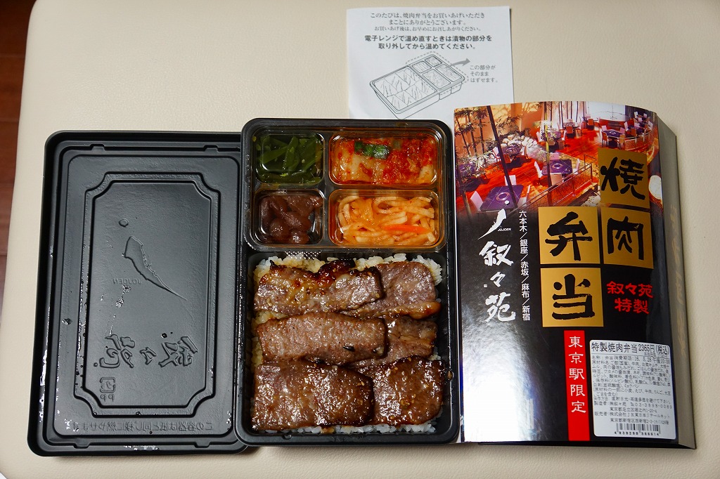 2015(平成27)年の発売か。上記の「叙々苑特製焼肉弁当」の廉価版と考えられる。容器は共通で、中身もほぼ共通で、中身の霜降り牛カルビが普通の牛焼肉になり、価格が約4割オフ。つまり、よくある牛肉駅弁を韓国風にしたもの。これでも値段も味も分量も、十分に高額で高級な牛肉駅弁。値段は1,400円、1,500円、1,600円と諸説ある。