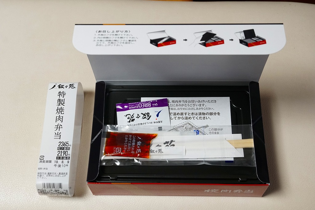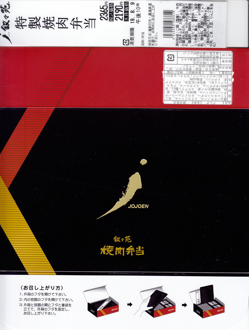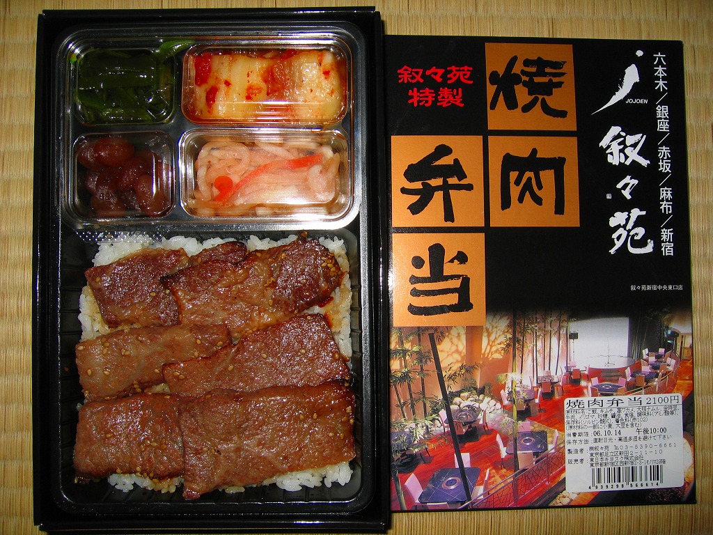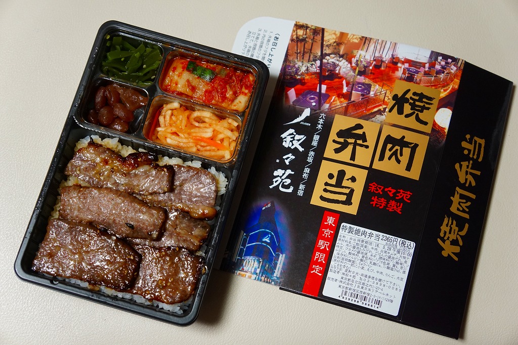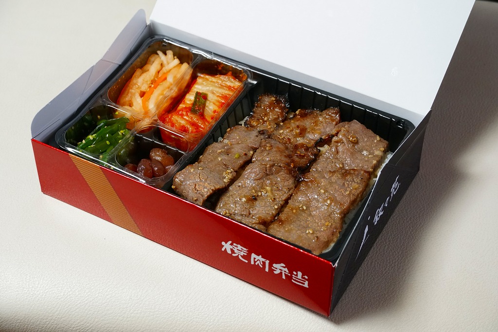 2006(平成18)年の東京駅弁デビューか。東京都心で芸能人に人気がある高級焼肉チェーン店と東京駅のキヨスクがタイアップした、韓国風焼肉弁当。見るからに高級そうな厚手の専用紙箱に透明のトレーを入れて、白御飯に焼肉6切れを載せる焼肉丼と、キムチ、茎ワカメ、大根ナムル、金時豆を詰める。価格は発売時で2,100円、2011年時点2,300円、2014年4月の消費税率改定で2,365円。