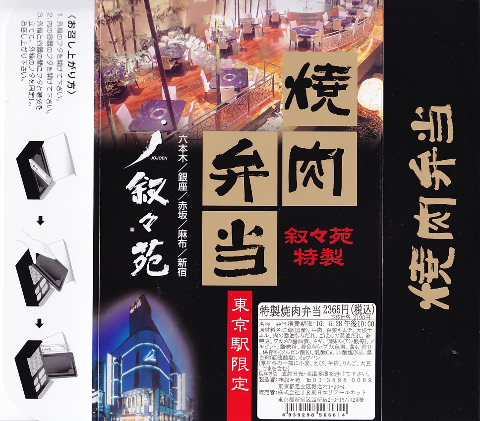 2016(平成28)年5月28日に購入した、東京駅弁のパッケージ。焼肉店の店内と外観の写真を掲載した、叙々苑特製焼肉弁当史上最も派手なデザインだったと思う。中身は発売当時も上記の2017年のものも、容器の構造を含めて変わらない。