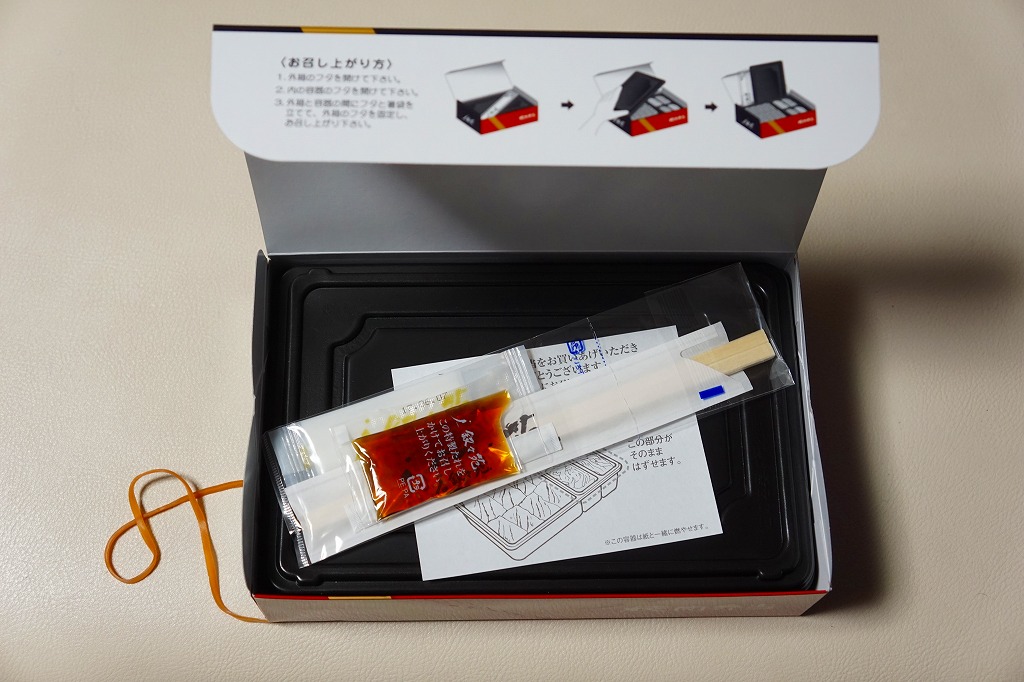 専用の紙箱に貼られる食品表示ラベルには、販売者が江崎グリコ、加工所が旭紙工とある。これは添付の口臭ケアタブレット「ブレオ」のものであり、弁当に対するものは商品名を記したプラ製の白帯に印字されていた。
