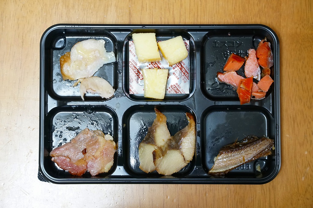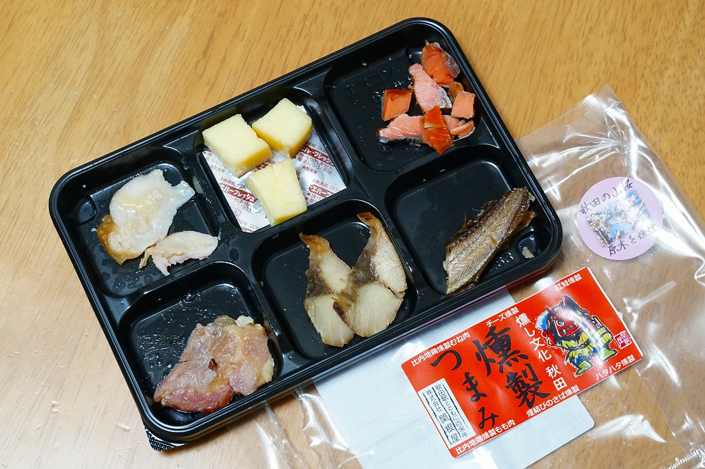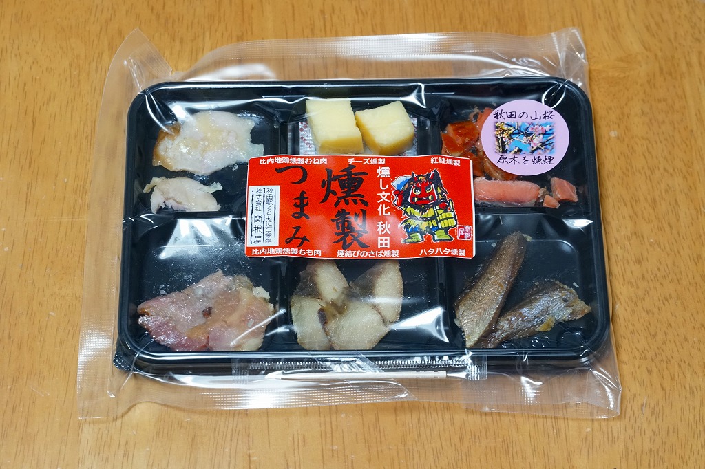 東京駅の駅弁売店で買えた商品。2019(令和元)年の発売か。黒いトレーに比内地鶏特製むね肉、チーズ、紅鮭、ハタハタ、サバ、比内地鶏もも肉を、すべて燻製にして並べて真空パック。商品としては駅でも空港でも、スーパーでもデパートでも買えるおつまみだと思うが、秋田駅の駅弁屋が販売者であることがポイント。駅弁マニアなら見てすぐ分かり、思わず手に取る商品。2023年までに東京駅で見掛けなくなった。