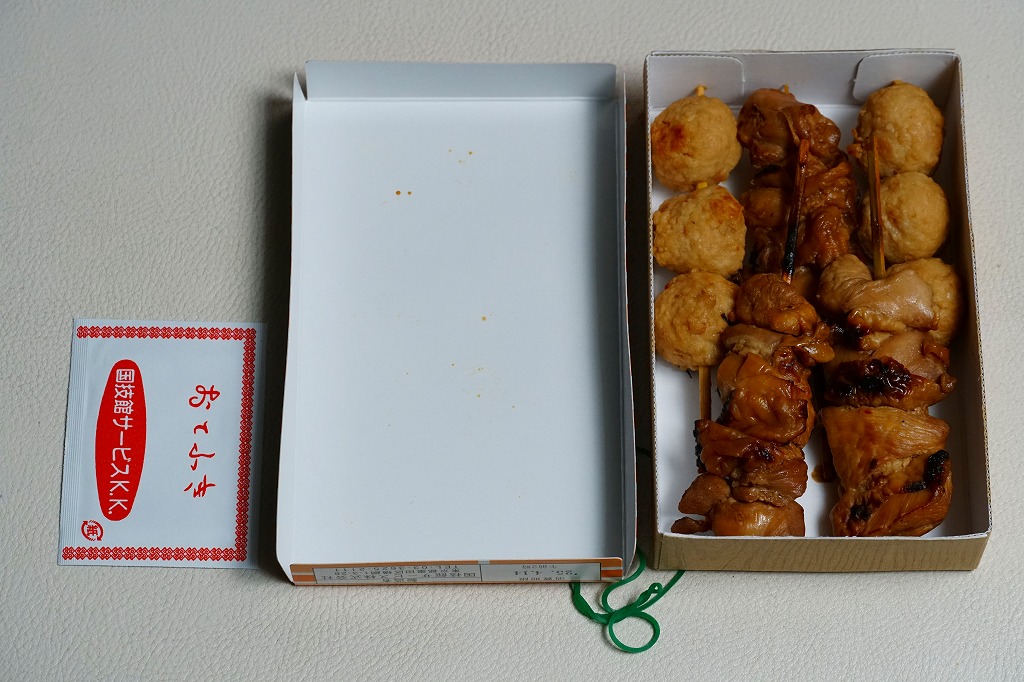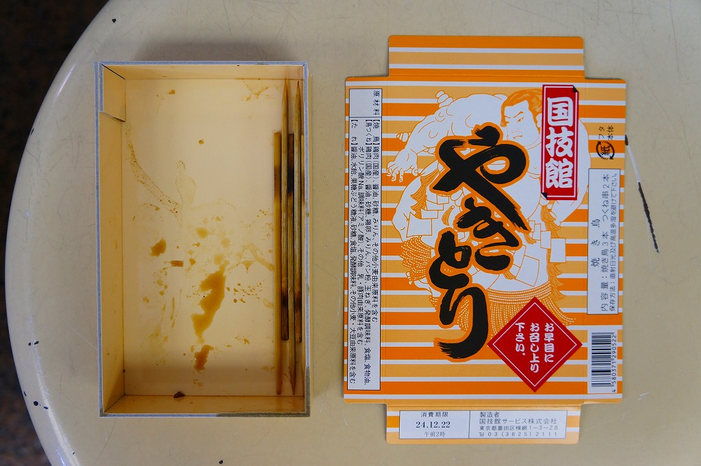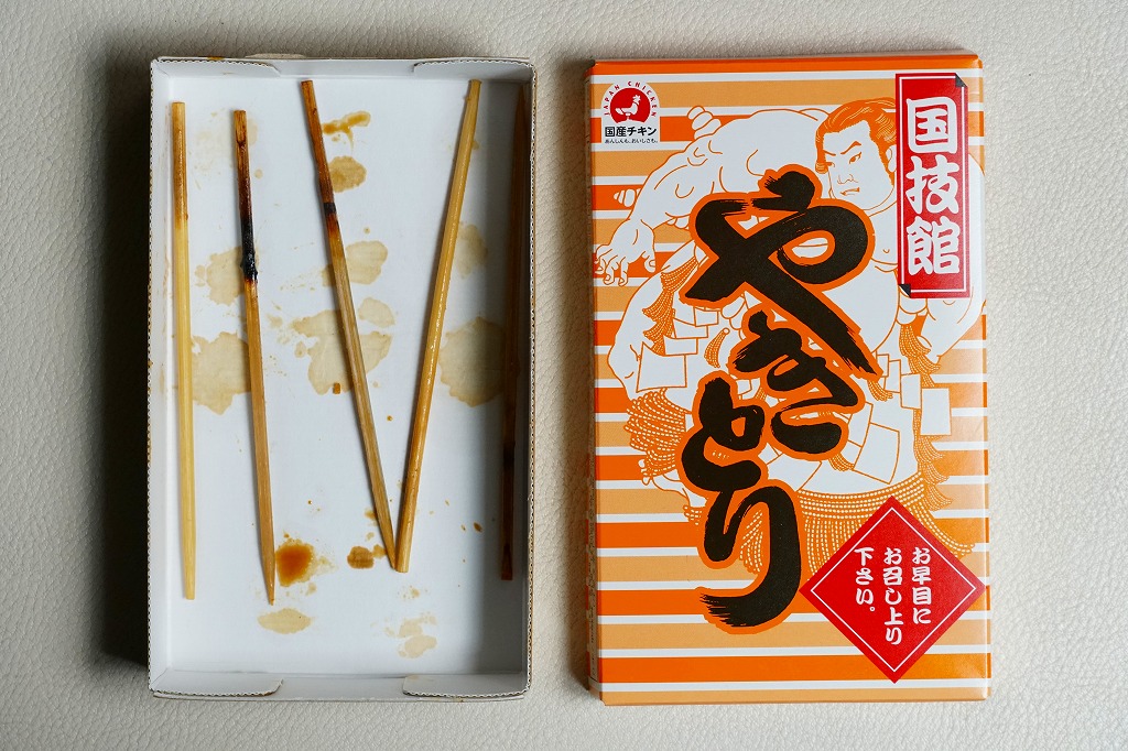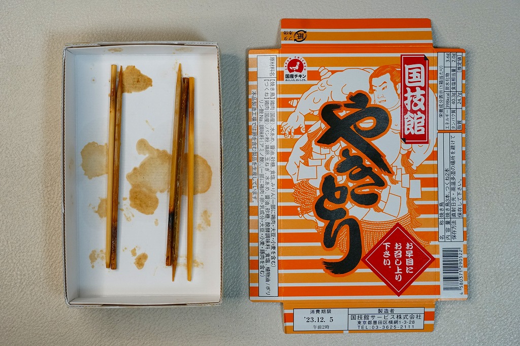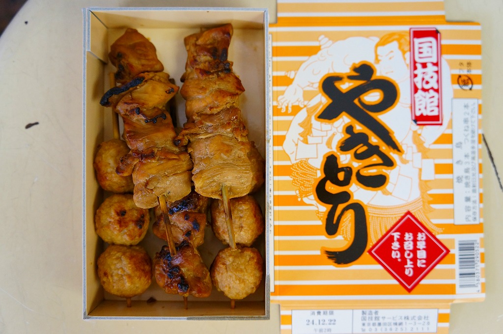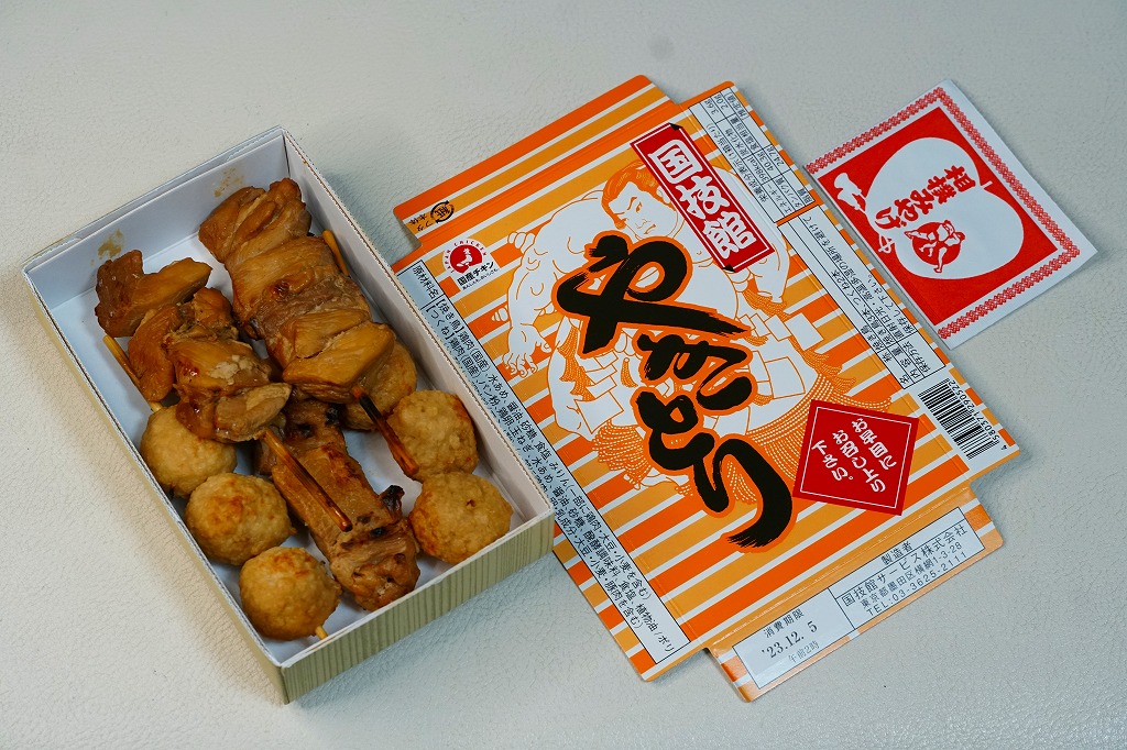 朝から夕方まで続く相撲の取組を観ながら食べるものであり、冷めてもおいしいよう、蒸してから焼く、6回たれに漬けるなどの工夫がされているという。そんな冷えてカサカサになった焼き鳥たちの風味は、相撲観戦や東京観光などとセットで語るべき、想い出のものなのだろう。価格は2012年の駅での発売時で600円、2019年までに700円、2023年時点で750円。